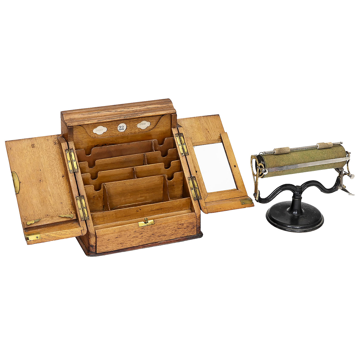 1) Writing desk, oak, with calendar, compartments and drawer, size closed 12 ¼ x 9 7/8 x 11 2/5 in.. – 2) Date stamp, c. 1870, Nathaniel L. Chamberlain, US patent no. 83253. – 3) Howe letter scale, Brandon Mfg. Co., USA, c. 1890. – 4) Acme No. 2, stapler, c. 1895. – 5) Dietzgen inkwell draftsman's tool, c. 1925. – And: 6) Perfect Copy Holder, c. 1900, Weber-Knapp Co., New York.