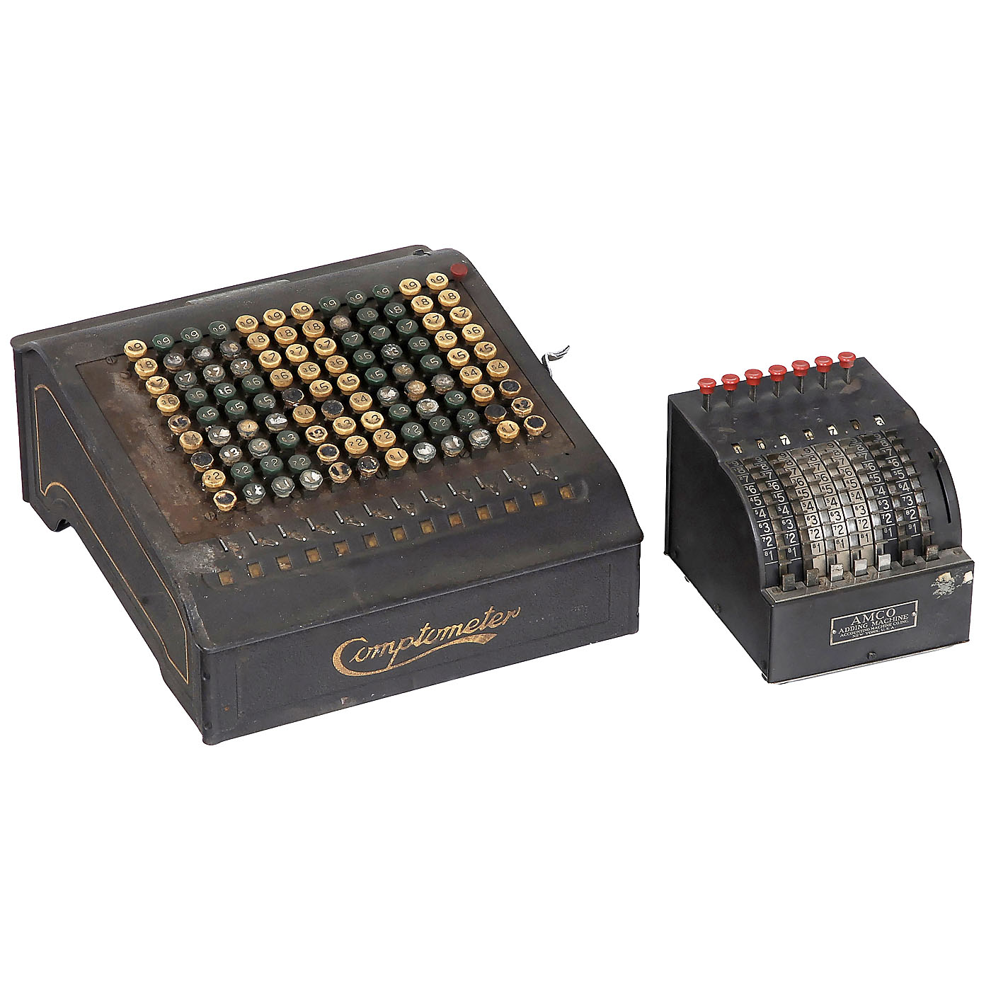 1) "Comptometer H", 1920, manufactured by Felt & Tarrent, Chicago. With 8-digit fast adding system and direct drive, serial no. 212699, reset lever loose. (3/3–4) – 2) "Clary Model 120", c. 1955, mechanism sticks. (2–3/4) – 3) "Remington Monarch", c. 1935, working, with printer. (3/2–3) – 4) "Comptometer", c. 1930, 12 digits, mechanism sticks, in need of cleaning. (4/5) – 5) "Remington Rand Model 71", c. 1940, with printer, mechanism sticks. (3/5) – And: 6) "Amco Adding Machine", c. 1920, single-axis multi-column adding machine, working. (3/2–3)