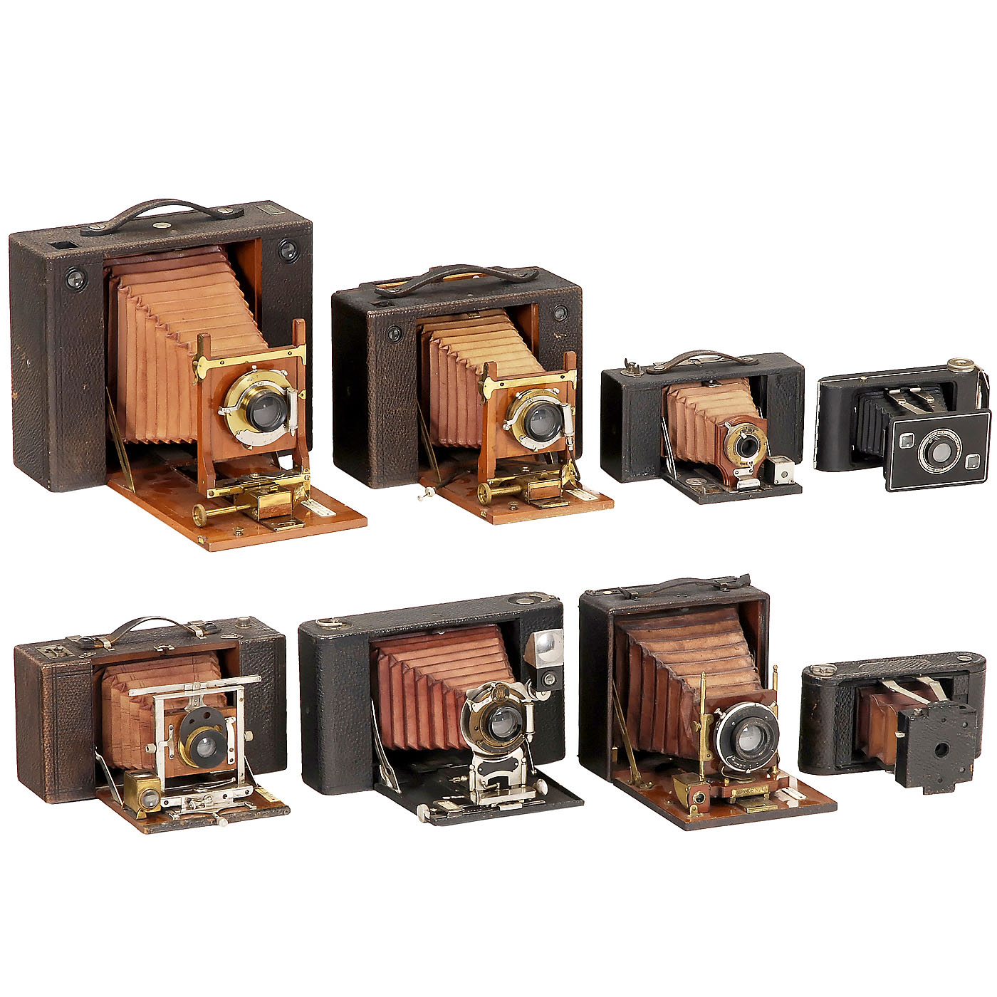 Cameras made by: Kodak, Krügener, Ernemann, ICA, Ansco, Orionwerk, Monroe and others. 1) No. 5 Cartridge Kodak. – 2) No. 4 Cartridge Kodak. – 3) No. 2 Folding Brownie. – 4) No. 4 Folding Hawk-Eye Model 3. – 5) No. 3A Folding Pocket Kodak. – 6) No. 1 Folding Pocket Kodak. – 7) No. 2A Folding Rainbow Hawk-Eye Special, green. – 8) No. 2A Folding Cartridge Hawk-Eye. – 9) Jiffy Kodak Six-20 Series II. – 10) Krügener Delta Cartridge 10 x 12,5. – 11) Ernemann Bob. – 12) ICA Orix 308. – 13) No. 10 Ansco Model B. – 14) Orionwerk Rio 79 C. – 15) Monroe No. 4. – And: 16) 2 other unmarked plate cameras.