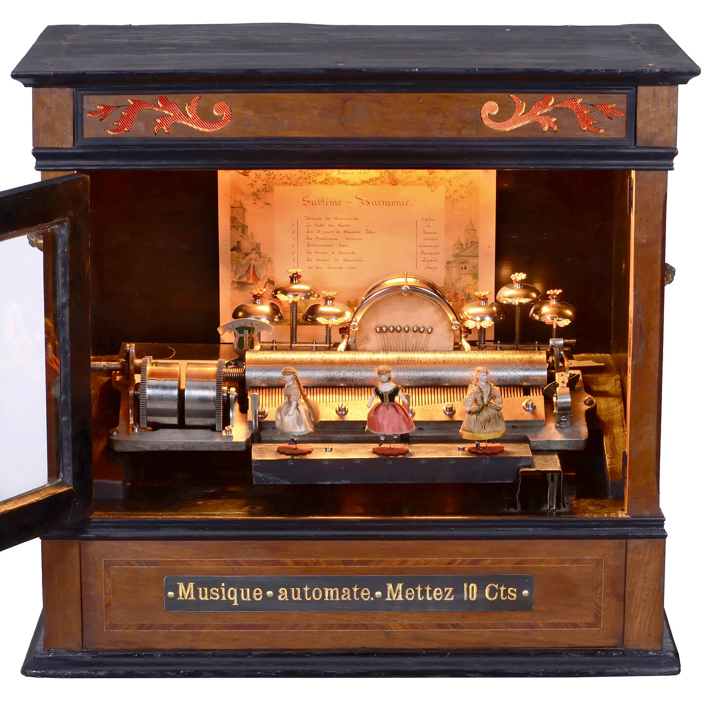 Playing 8 airs accompanied by drum and 6 optional bells with flower finials and butterfly strikers, one percussion comb and 2 musical combs with total of 92 teeth (2 missing teeth and 1 missing tip), crank-wound nickel-plated movement, tune-sheet and walnut-veneered case with kingwood banding, sound frets, coin drawer and card plaque embossed "Musique automate, Mettez 10 Cts", wd. 28 x dp. 16 ½ x ht. 26 in. (71 x 42 x 65,5 cm), with cabinet key and replacement crank. Playing condition, coin-mechanism removed, movement would benefit from cleaning, drawer missing lock. - A rare example of a station musical box!