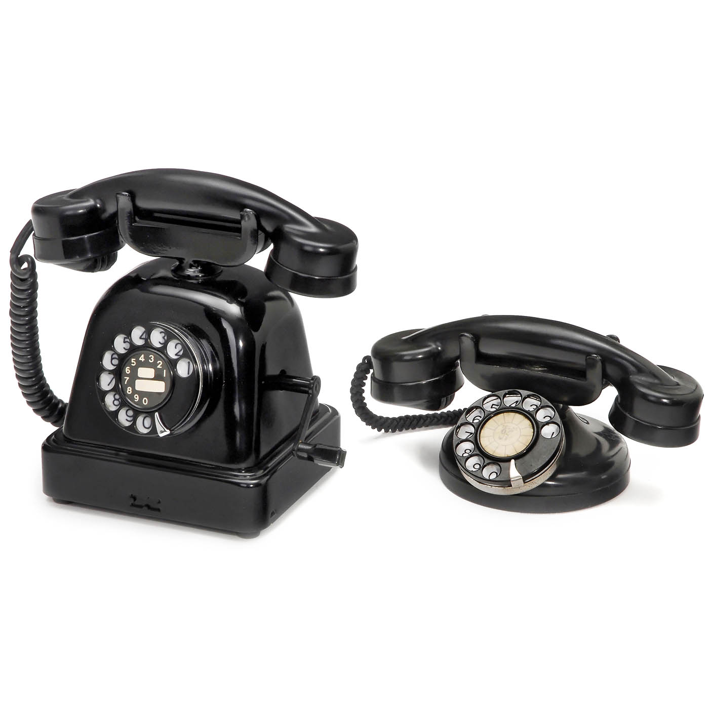 Anvers, Belgium. 1) Bakelite case and handset, with dial and crank inductor, c. 1948. - And: 2) Series 30, bakelite case and handset, with dial, heavy cast-iron base, c. 1936.