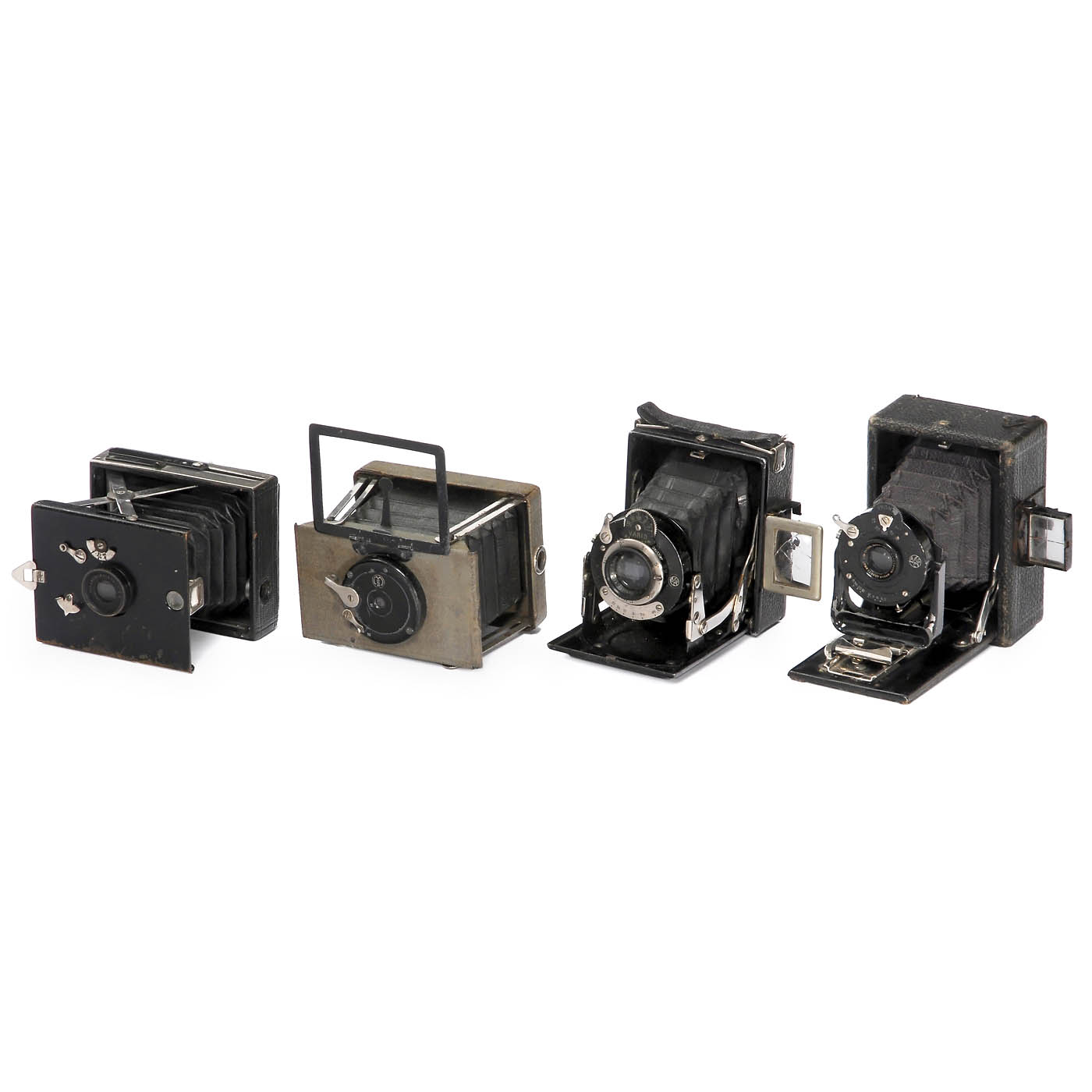All cameras in format 4,5 x 6 cm and with focusing screen back, some without ground glass. 1) Val. Linhof, Munich. Vertical format, Tessar 4,5/5,5 cm, no. 145938, without viewfinder. Unknown version! (3/3) – 2) Ernemann, Dreden. Heag XV, Ernon 6,8/80 mm. (3/3) – 3) Kolar, Prag. Kolex, Rekolar 4,5/7,5 cm, glass of viewfinder with crack. (3-/3-) – 4) Chaste, Magdeburg. Monar Anastigmat 6,8/75 mm. (3-/3-) – 5) Unmarked, Rodenstock Eurynar 6,8/9 cm. (3-/4) – 6) Chaste, Magdeburg. Trench camera Minax, olive green. (3-/3-) – 7) Krauss, Stuttgart. Nanos, Steinheil Unofocal 4,5/7,5 cm. (3-/3) – And: 8) Unmarked, no. 24930Z, detective Aplanat F:6,8, aperture lever missing. (3-/4)