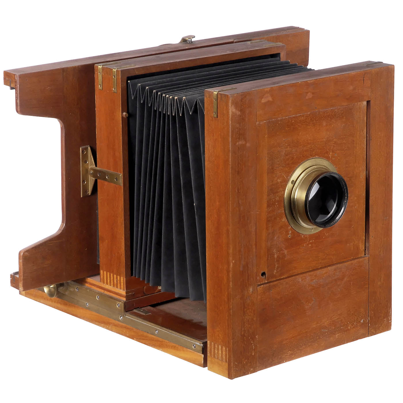 1) Germany. Studio camera for 24 x 24 cm, extension up to 76 cm, back turnable with multiplicator-adapter and focusing screen. With two studio cassettes for 24 x 24 or 18 x 24 cm, rouleaus working well and are ligth-tight. Camera size: 32 x 50 x 40 cm. – And: 2) Oscar Zwierzina, Dresden. Kunst-Portrait Objektiv "Plasticca" 4/350 mm no. 41615, glass clean, with original yellow filter behind the lens.