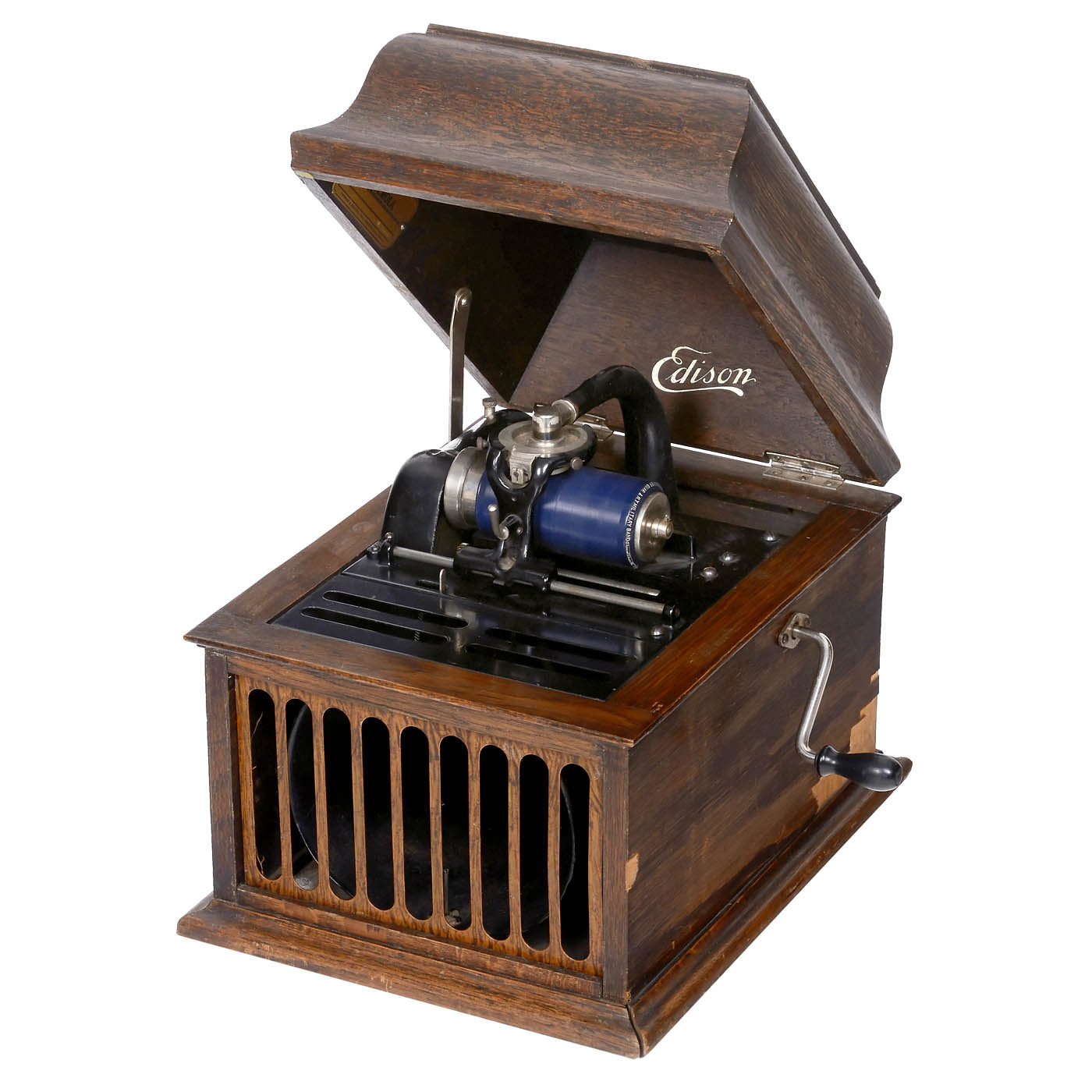 1) Edison Gem Phonograph, model A, c. 1902, for 2-minute cylinders, serial no. G68197, with model H reproducer, brass horn, oak base and lid, spring and mechanism in need of cleaning. – And: 2) Amberola model 30, 1915 onwards, 4-minute model, serial no. 235788, oak case (veneer damage on right side), working. One of the smallest table-top Amberolas.