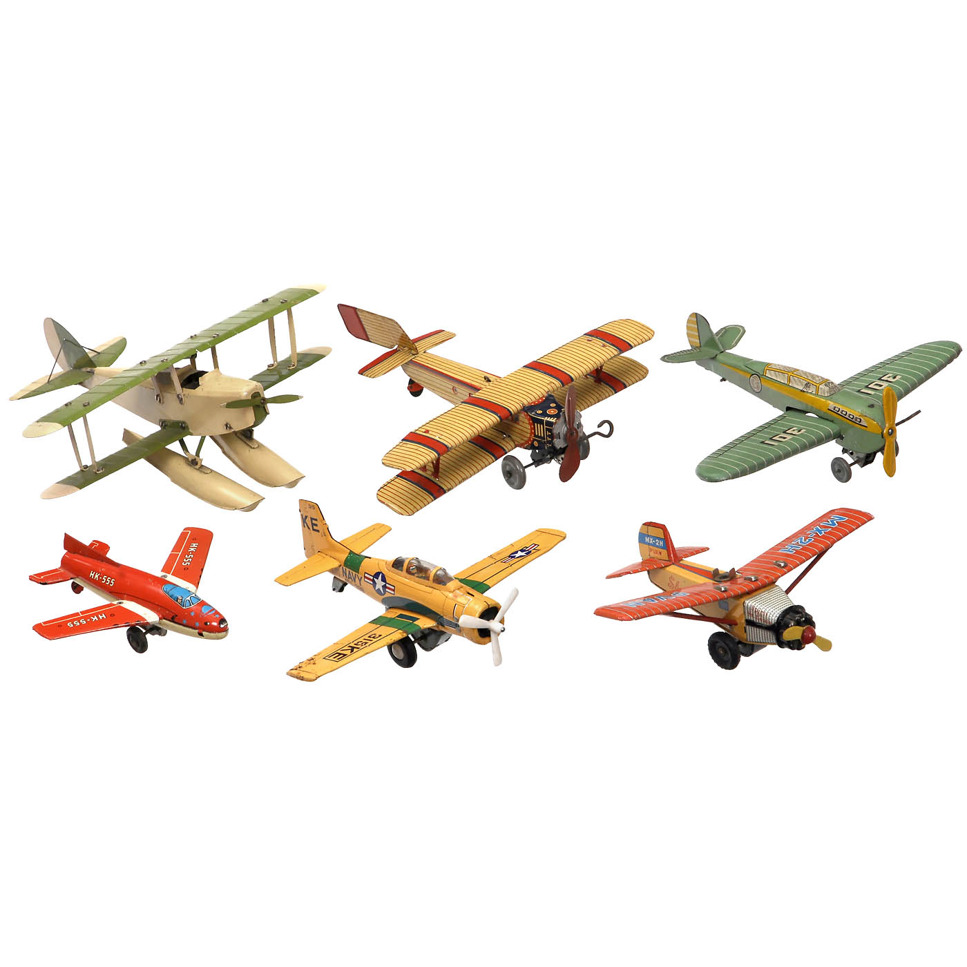 1) Arnold, Germany. Douglas DC 6B, The Flying Dutchman (De Vliegende Hollander), lithographed tin, friction drive (working), length 10 in. – 2) Yonezawa, Japan. Scandinavian Airlines System, lithographed tin, friction drive (working), length 9 ½ in. – 3) Hammerer & Kühlwein, Germany. HK-555, lithographed tin, friction drive (working), length 6 ¼ in. – 4) Wells, England. No. 301, lithographed tin, friction drive (working), length 8 ¾ in. – 5) Unmarked, probably Wells, England. Lithographed tin, spring drive (working), length 9 ½ in. – 6) Marusan, Japan. Viking, Scandinavian Airlines System, lithographed tin, friction drive (working), 1 wheel missing, length 12 ½ in. – 7) Meccano, England. Biplane seaplane, painted tin, length 10 in. – 8) Bandai, Japan. MX-2H, Sky Bird, lithographed tin, friction drive (working), length 6 ¾ in. – 9) Bandai, Japan. 315-KE, Navy, lithographed tin, friction drive (working), length 6 ¾ in. – 10) Tippco, Germany. Convair KLM PH-TGJ, The Flying Dutchman (De Vliegende Hollander), lithographed tin, friction drive (working), length 10 in. – And: 11) 2 more models.