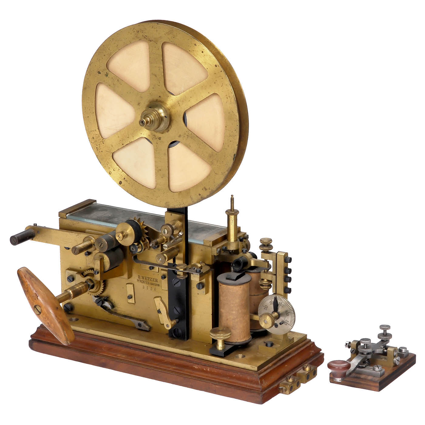 H. Wetzer, Pfronten, Bavaria. No. 3158, ink-writer telegraph receiver, spring-driven (working), with paper-strip coil on top, original lacquered brass, beveled top and mahogany base. With two additional paper-strip coils on cast-iron bases, Morse key and a large sounder by Wetzer.