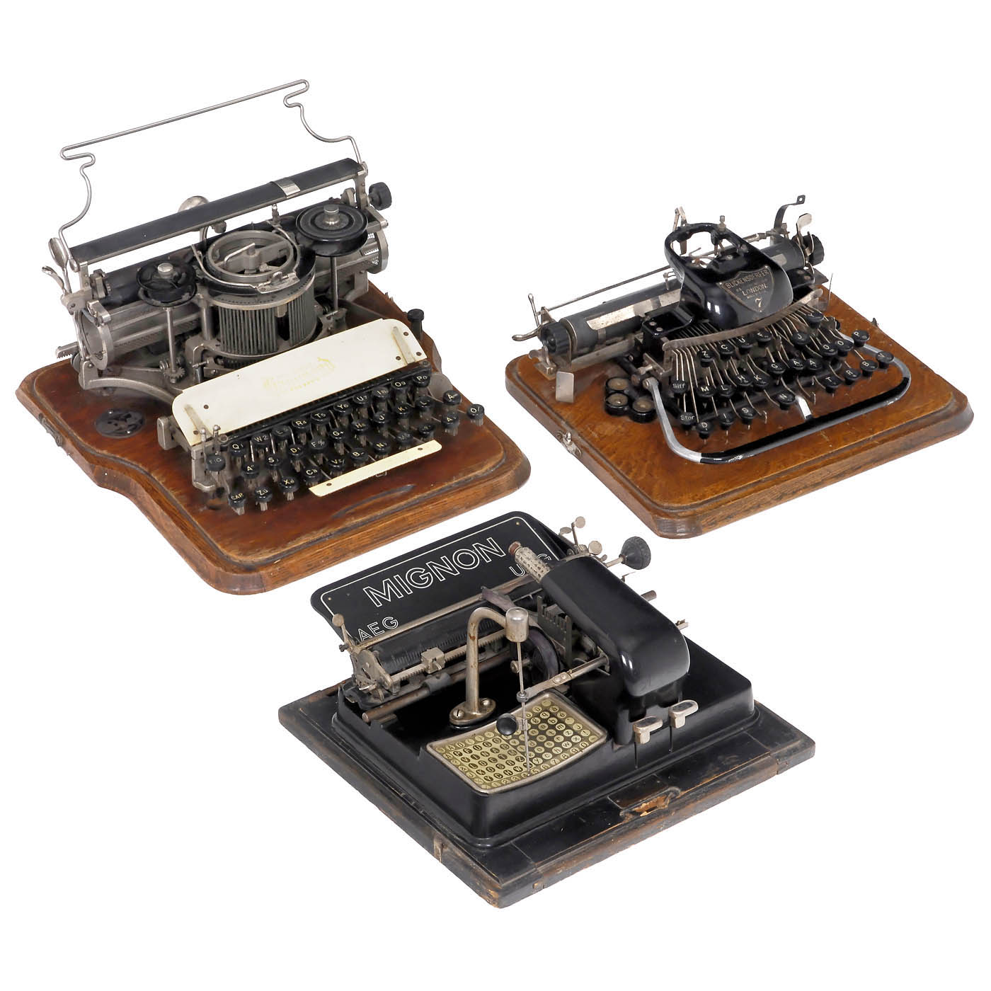 1) "Hammond No. 12", with straight universal keyboard and wood cover, serial no. 101841. - Literature: Martin, 1949, p. 79. (3+/3) - 2) Blickensderfer No. 7, c. 1905, American typewheel machine, missing four key tops and type wheel. - Literature: Martin, 1949, p. 136. (4-/4-) - And: 3) Mignon model 3, 1913 onwards, German index typewriter, interchangeable type sleeve, downstroke, by AEG - Union Schreibmaschinen GmbH, Berlin, with original tin cover. - Literature: Martin, 1949, p. 200. (3/4)