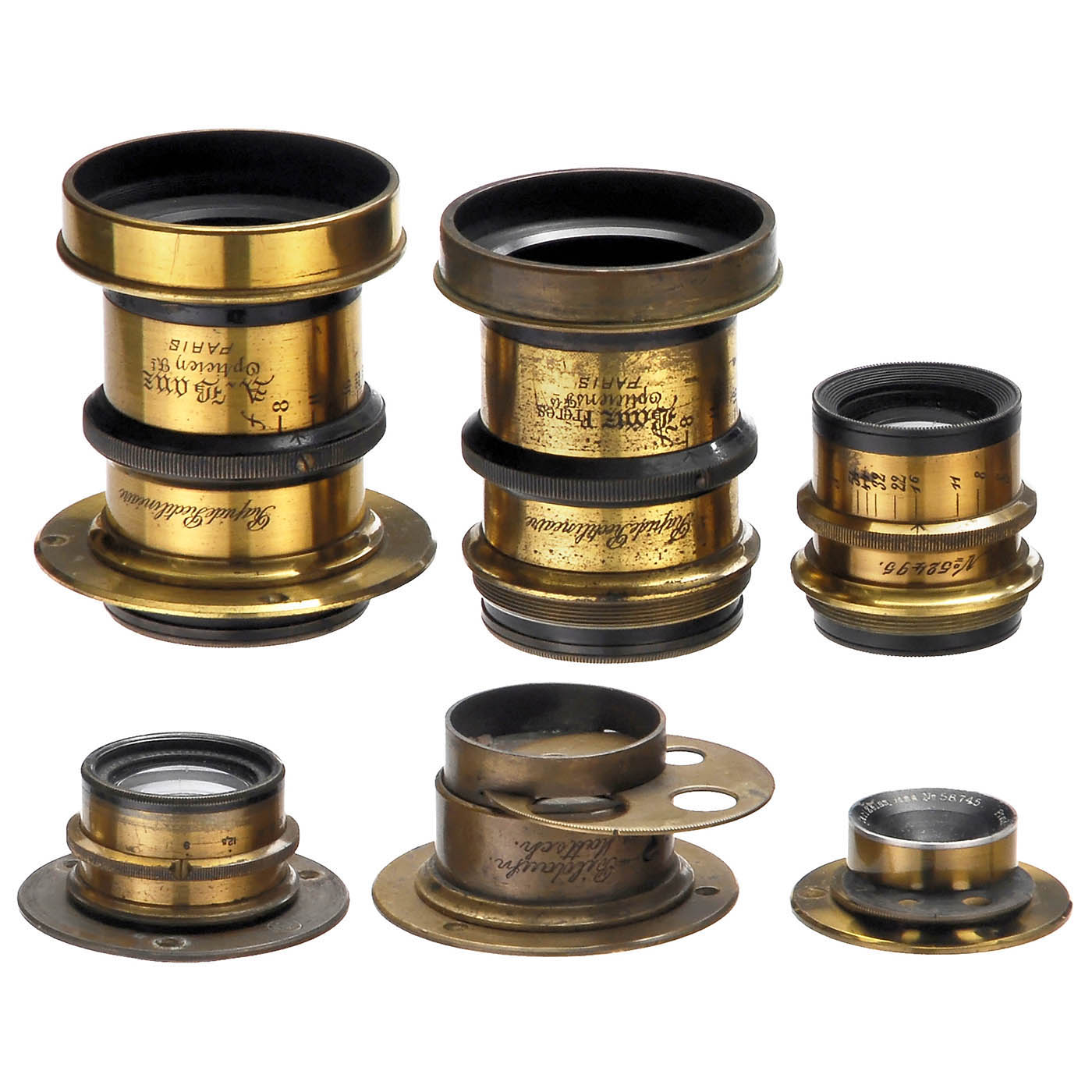 1) Unmarked. In case set of 7 aplanatic lenses 15-75 cm, 2 distance rings and mount with iris. (3/3) - 2) Zeiss, Jena. Protar 18/86 mm, no. 58745, revolving stop, inside some dust, with mounting ring. (3+/3-) - 3) Rodenstock, Munich. Imagonalsatz Nr. 1, with all 5 lenses and iris mount, sunshade from lens 1 missing, with original yellow filter, instructions and case, top loose. (3-/3-) - 4) Bauz Opticien, Paris. Rapide Rectilinéaire, approx. 8/21 cm, with mounting ring. (2-3/3) - 5) Bauz Frères, Paris. Rapide Rectilinéaire, approx. 8/21 cm. (3-/3) - 6) Rodenstock. Recti-Aplanat 8/140 mm. (2-/3) - 7) Meyer, Görlitz. Weitwinkel Aristostigmat 9/165 mm, with mounting ring. (3-/3) - And: 8) Beginner lens approx. 30 cm with revolving stop, tube adjustable from screen to plate, mounting ring signed with "A.R.M.". (4/3-)