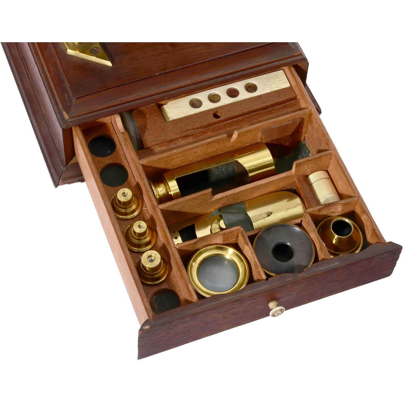 Unsigned, lacquered brass, square mahogany box base with accessory drawer at the front, rack-and-pinion focusing, single mirror, closed height 10 1/5 in., with 4 objectives (1-4) and one ocular, 4 bone slides, forceps, bulls-eye condensor and fish-plate, in pyramid-shaped mahogany case, focusing defective, ocular lens cloudy.