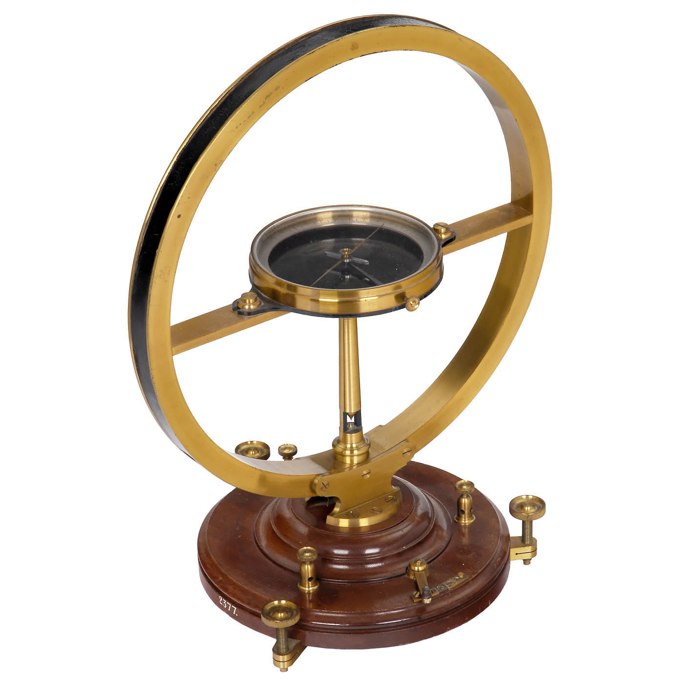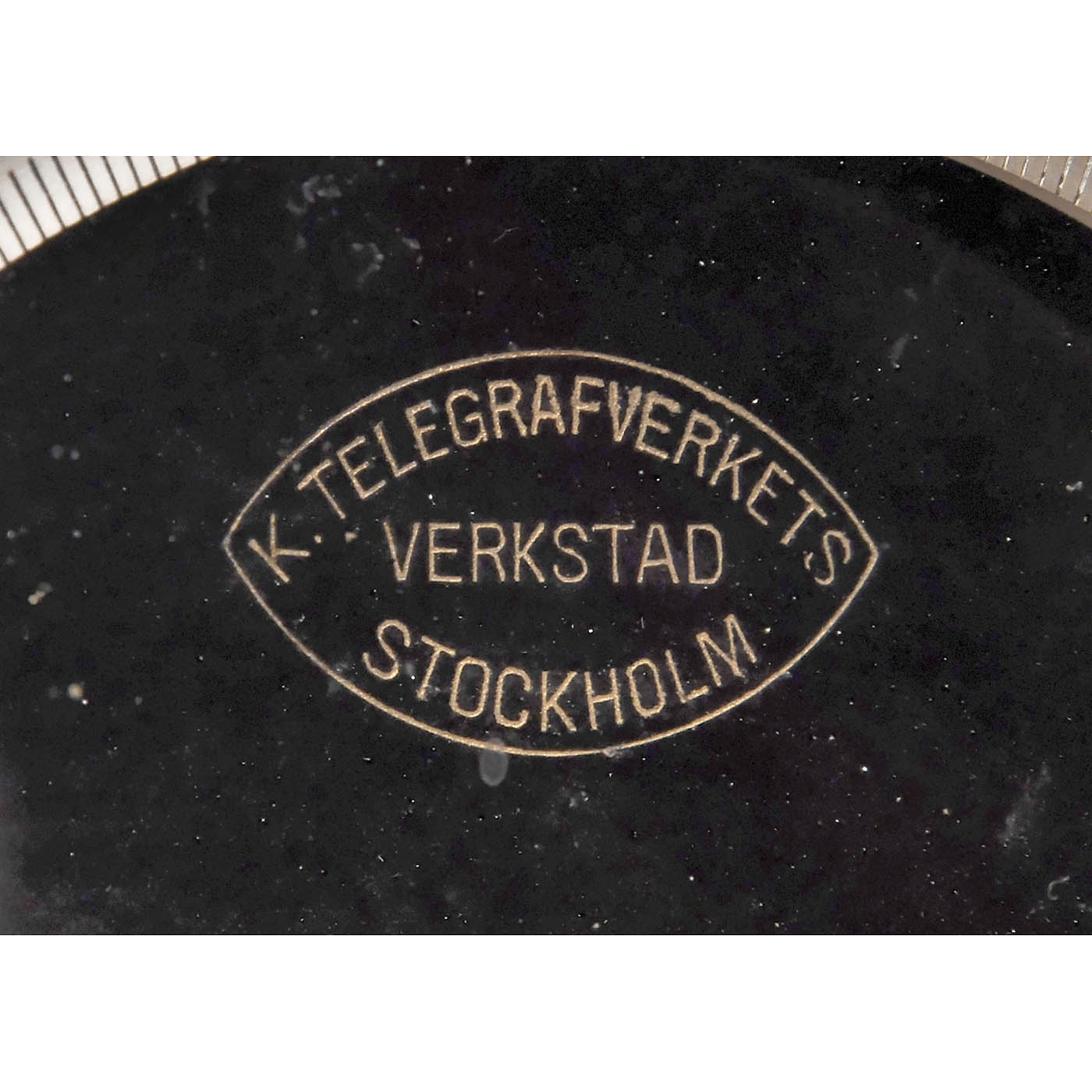 K. Telegrafverkets Verkstad Stockholm. Original lacquered brass, silvered scale, mahogany base, three adjustable feet, overall height 15 3/5 in., excellent original condition.