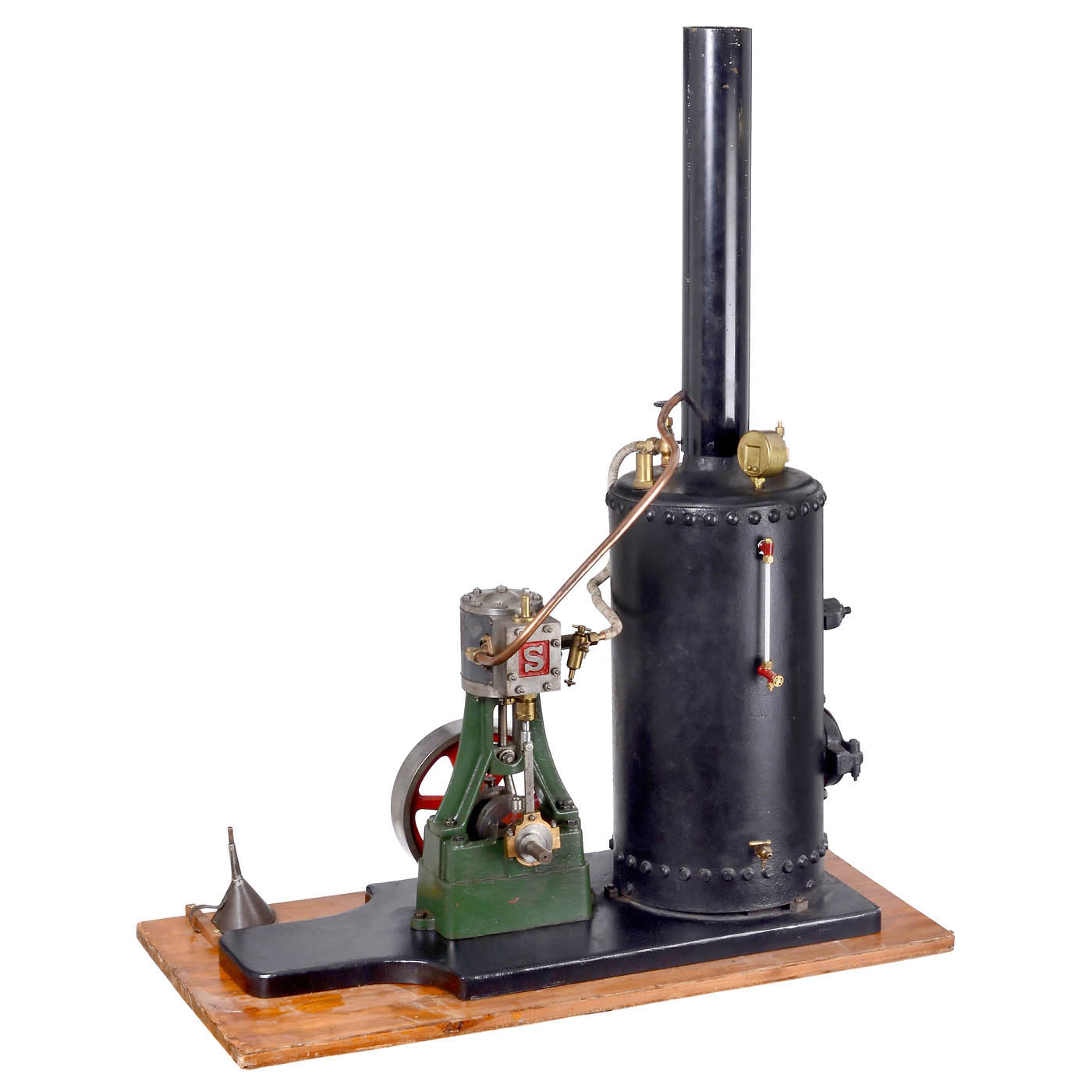 1) Stuart no. 5a, cast iron, steel and gunmetal, height 15 in., cylinder Ø 3 ½ in., flywheel Ø 7 ½ in., the engine is capable of producing 1 1/2 bhp running at 800 rpm. - And: 2) Coal-fired boiler, riveted cast metal, Ø 9 7/8 in., height without chimney 19 inch, with water-level glass, manometer, water drain cock and pressure relief valve.