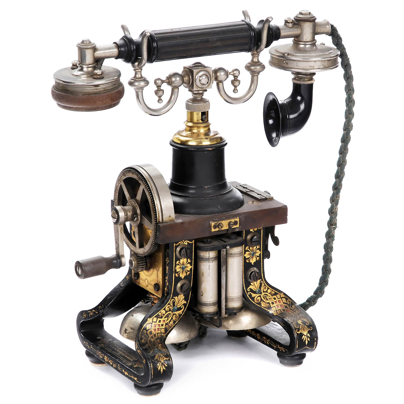 L.M. Ericsson, Stockholm. Model 375, handset with speaking horn, lightning protection, centrifugal switch, ebonite plate, crank inductor, double alarm clock. - A very early model, only four terminals, no struts between the magnets and large-scale decoration, in very good original condition.