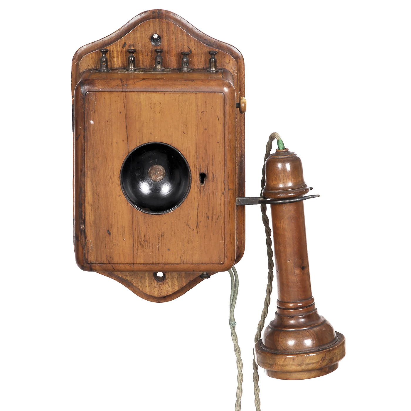 De Jongh, Brussels. Walnut case, transmitter with metal plate, platinum contact and carbon contact, turned walnut Bell-type earphone. - Note: The Blake transmitter was the first successful telephone microphone and was made under license by companies across the world. An invention with iconic significance to collectors today.