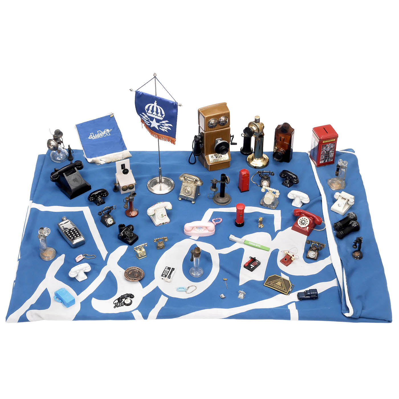 1) 38 miniature telephones, plastic, ceramic and metal, as paperweights, pencil sharpeners, salt and pepper shakers, money box or for decoration. - 2) 4 liqueur bottles in telephone form. - 3) 66 historical postcards with funny and erotic motifs. - 4) Over 100 postcards on the theme of telephones. - 5) Large Ericsson flag, dimensions 71 x 107 in. - 6) 3 plates and 2 spice jars, Nymolle, Denmark, for L.M. Ericsson, design Bjørn Wiinblad. - 7) 5 wall plates, Scan Lekven, early Ericsson telephones as motif. - 8) Glass ceramic "Rikstelefon". - 9) 2 paperweights, glass, Ø 3 1/6 in. - 10) 3 money plates and 1 ashtray. - And: 11) 2 milk jugs, Karlskrona, Sweden.