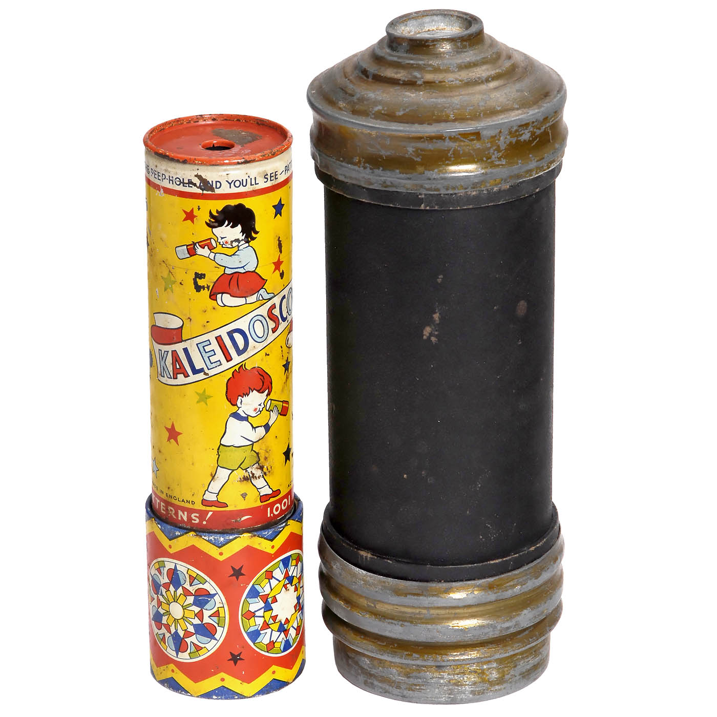 1) Zootrope on wood base, ht. 37 cm, drum Ø 26 cm, with two card-mounted strips. (3/3) - 2) Acme Toys, England. "Kaleidoscope", ht. 21 cm, colored printed tin, small dent, with original glass granulate filling. (3-4/3) - And: 3) Early kaleidoscope, lightweight card tube with simulated fish skin covering and metal caps, lg. 26 cm, Ø approx. 90 mm, with original small colored glass pieces. (3/3)