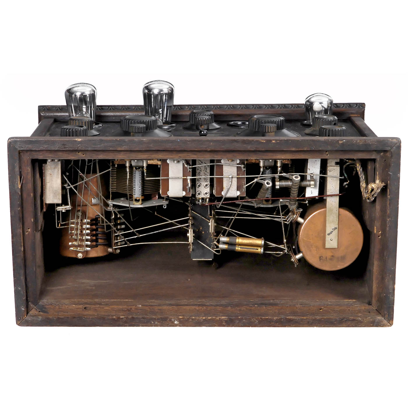 Siemens & Halske, Berlin. Four-tube receiver (one tube missing), long wave and medium wave, battery-operated, for headphones or low-frequency amplifier, missing base panel, oak case with sloping black ebonite control panel.