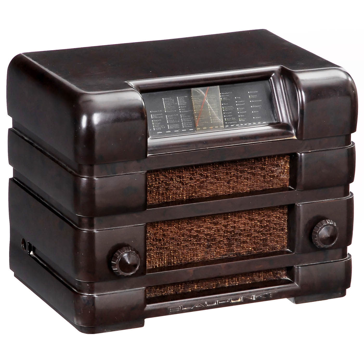 1) 330 WL "Nauen", c. 1934, Telefunken Germany (TFK), four tubes, medium wave and long wave, built-in dynamic loudspeaker, 110-240 volts AC, complete with tubes and back panel. - 2) Super 4LWP, c. 1933, Blaupunkt (Ideal), Berlin, five tubes, three wavebands, mains operation, built-in loudspeaker, with tubes, two side knobs missing, back panel replaced. - 3) Model 270, c. 1934, Telefunken Prague, three tubes, mains operation, dynamic loudspeaker, without tubes, with back panel. - And: 4) All Electric Receiver M 23 AC, c. 1932, Ekco, E.K. Cole Ltd., Southend-on-Sea, England; three tubes, medium wave and long wave, mains operation, built-in dynamic speaker, complete with tubes and back panel.