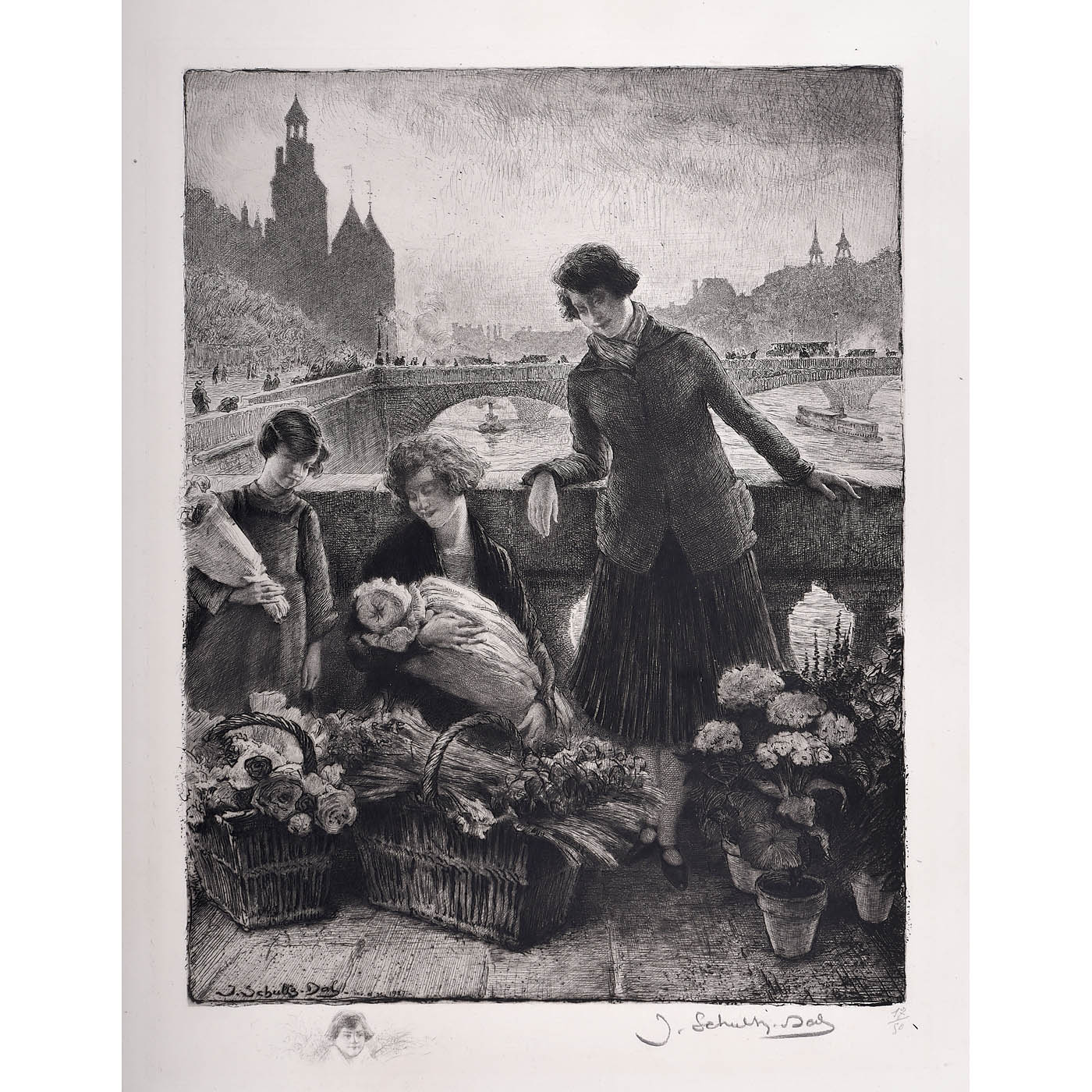 1) Lithograph by Fritz Reuter, 1881, "Fair", printed by C. Hacker's Institut, Berlin, 23 x 33 cm. - 2) Ink drawing by Theodor Grätz, c. 1920, "Circus elephant", for the Fliegende Blätter, 29 x 37 cm. - 3) Four chalk lithographs by Lou Albert-Lasard, c. 1925, from the series "Montmatre", signed, published by Kiepenheuer-Verlag, Potsdam, 37 x 48 cm. - 4) Lithograph after Johan Fredrik Martin, London 1772, "The Sausage Woman, or a Scene in Covent Garden", printed for Robert Sayer, 25 x 35 cm. - 5) Copper engraving after Karel Dujardin, "Les Charlatans", 31 x 26 cm. - 6) Lithograph, c. 1840, "Der Hühnermarkt in Frankfurt am Main", 50 x 34 cm. - 7) Pencil drawing by J Schultz-Dahl, 1927, "Blumenverkäuferin", print no. 17/50, signed by hand on lower right, 25 x 32 cm.