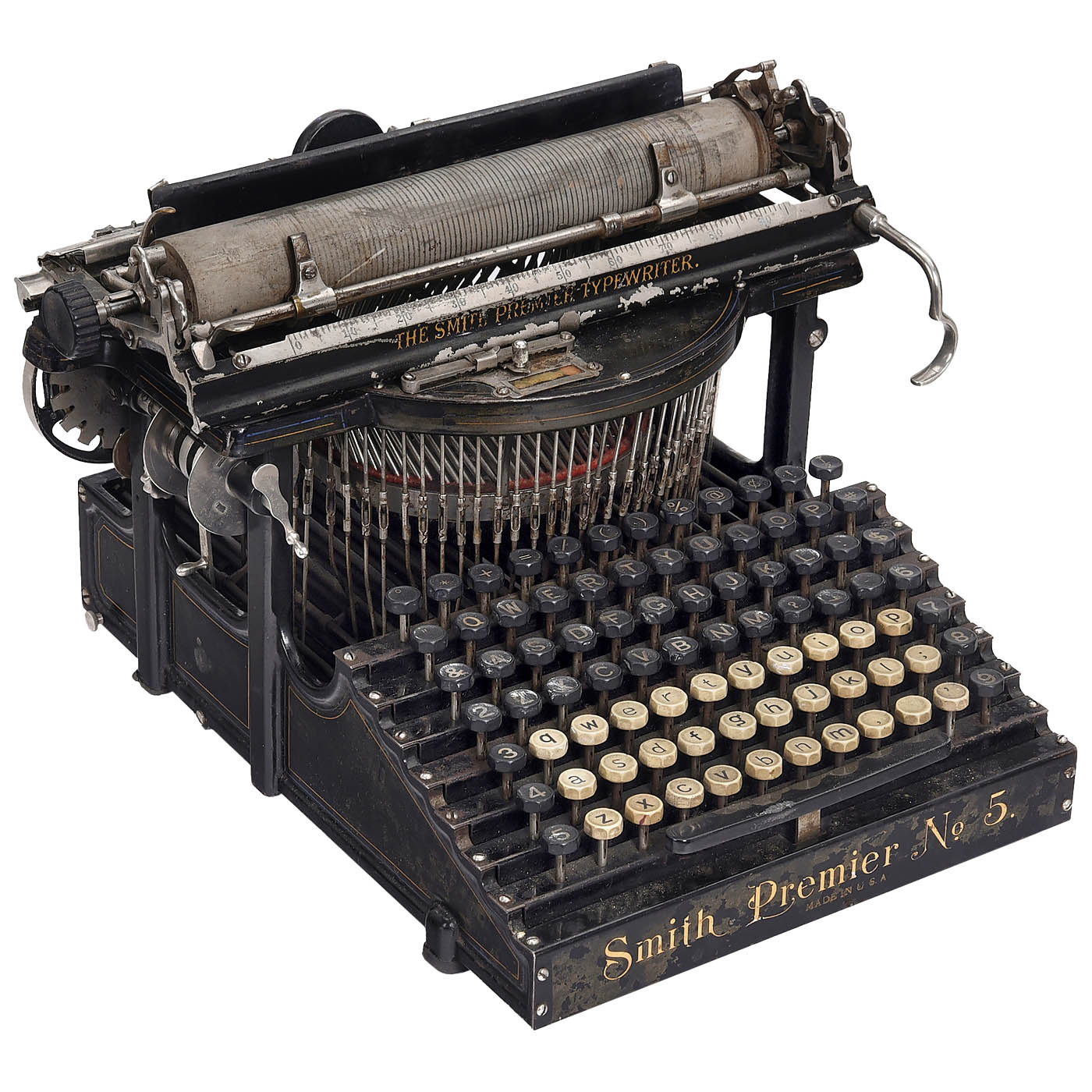 1) "Remington Standard No. 2", 1890, serial no. 92907, American upstroke machine, in need of cleaning, carriage movement defective. Successor to the famous Sholes & Glidden, the first successful typewriter in the world. (3/4) – 2) "Underwood No. 5", 1900 onwards, mechanism somewhat stiff, in need of cleaning. Arguably the most successful typewriter design, the inspiration of many imitators. (2–3/3) – 3) "Oliver No. 9", c. 1919, serial no. 822119, working, in need of cleaning. (3/3) – And: 4) "Smith Premier No. 5", c. 1905, Smith-Premier Typewriter Company, Syracuse, full keyboard, 82 keys in 7 rows, upstroke, carriage movement defective. (3/4)
