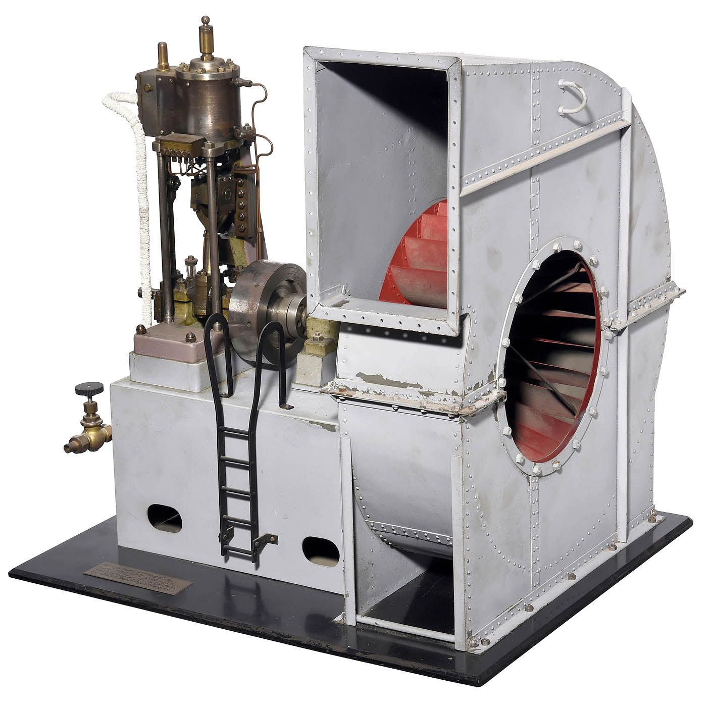 Model of a fan used on the Metropolitan Railway c. 1860, sheet metal, brass and steel, single cylinder, Ø 1 7/10 in., crosshead guide in plane bearings, sliding control with eccentric ring, lagged main steam line, main stop valve, 2-bearing fan drive shaft, riveted and bolted ducting, fan Ø 7 in., brass maker's plaque "Sidney Bowles, Chief Engineer", 14 x 11 ¾ x 14 ½ in.