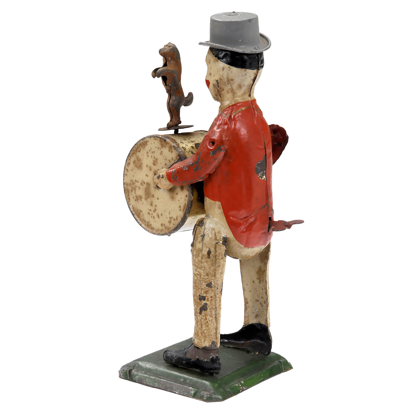 Siegfried Günthermann, Nuremberg. Clown drummer with performing dog on square green platform, handpainted tin, clockwork, mechanism sticks, height 8 ½ in.
