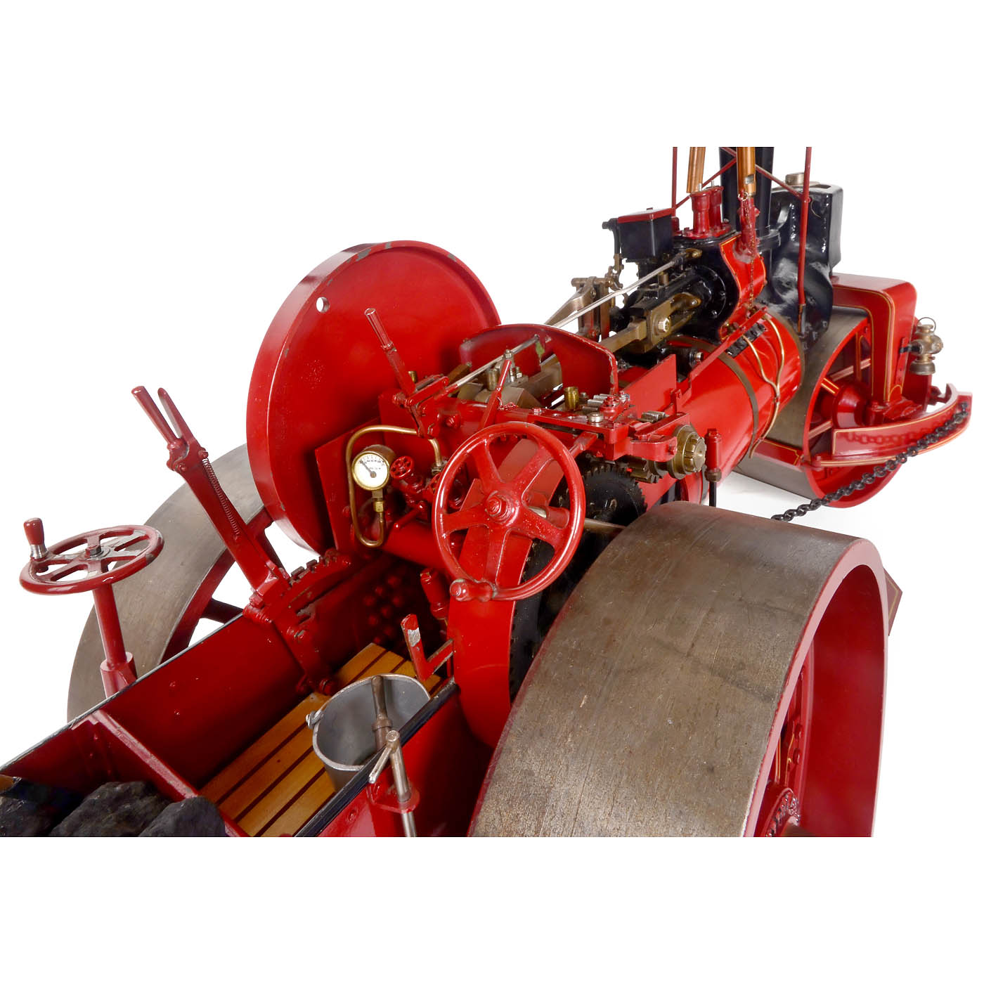 Brass, steel and cast iron, finished in dark red livery painting, builder's plaque: "Chas Burrell & Sons Limited Manufacturers Thetford, England", coal-fired silver-soldered copper boiler with steam pressure gauge, water sight glass, drains, regulator, fire box door and lever direction control, double-acting cylinder of 1 3/4 in. diameter, open crank motion with Stephenson's gearing, mechanical lubricator, solid disc flywheel 7 in. diameter, two-speed gearbox, fusee-and-chain steering to the front wheel, parking brake to the rear axle, wood canopy mounted on metal stays, overall length 34 in. - A detailed live-steam model with all its fixtures and fittings.