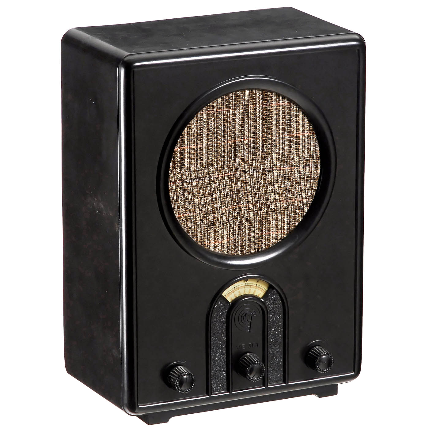 1) Volksempfänger VE301Wn, 1937, Radio-Funk-Werkstätten, magnetic loudspeaker, MW + LW, 3 tubes, 110–220 volts AC, bakelite case (minor crack), original rear panel, complete with all components and Membra blocking circuit type SK2. – 2) Telefunken 340WO "small cat's head", 1931, 5 tubes, MW + LW, 110, 125, 150 and 220 volts AC, bakelite case, original rear panel, complete with all components. – And: 3) Volksempfänger VE301Dyn W, 1939, Loewe-Opta, dynamic loudspeaker, MW + LW, 3 tubes, 110–220 volts AC, bakelite case, original rear panel.