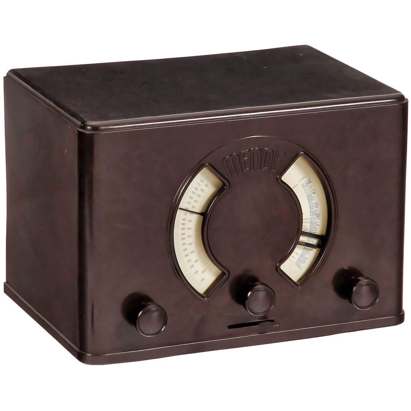 All complete with rear panels and tubes, bakelite cases in good condition, for external speakers. 1) AEG Ultra Geadem G, c. 1932, 4 tubes, long wave and medium wave, 110, 150 and 220 volts DC, optical station indicator with 104 station labels for personalised design of the scale. – 2) Mende 138W, c. 1932, 5 tubes, long wave and medium wave, 110, 125, 150, 220 and 240 volts AC. – 3) Mende E38W, c. 1930, 4 tubes, long wave and medium wave, 110, 125 and 220 volts AC. – And: 4) Saba 33W, c. 1930, Schwer & Söhne, Villingen, 4 tubes, long wave and medium wave, 110–220 volts AC.