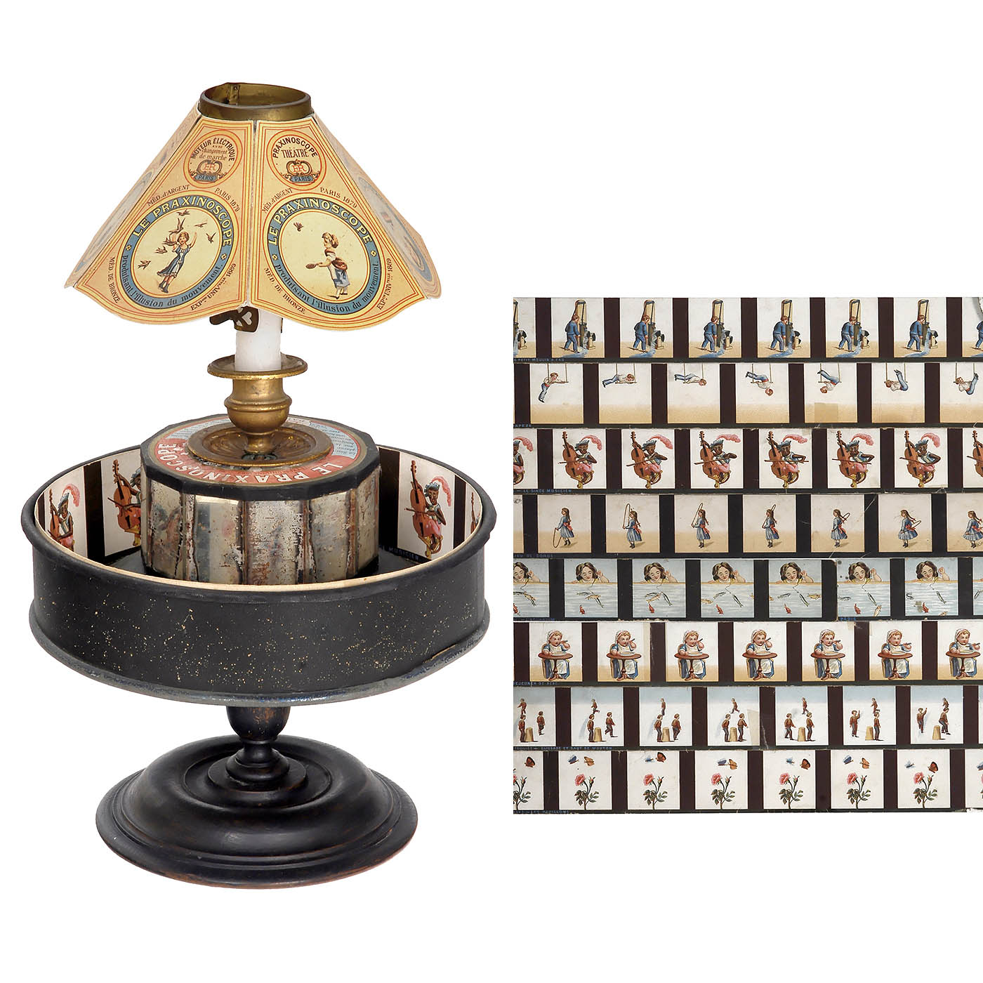 E. Reynaud, Rue Rodier, Paris. Model from 1889, with replica shade, candle-holder, original mirrors and 8 original strips (one strip with minor damage). A very important and early pre-cinema collector's item! – Note: An improvement of the zoetrope, Émile Reynaud's praxinoscope used a series mirrors with prism-like effect to create moving images without the typical 'flicker' associated with 'persistence of vision' devices. – Literature: Coe, "The History of Movie Photography", p. 35.