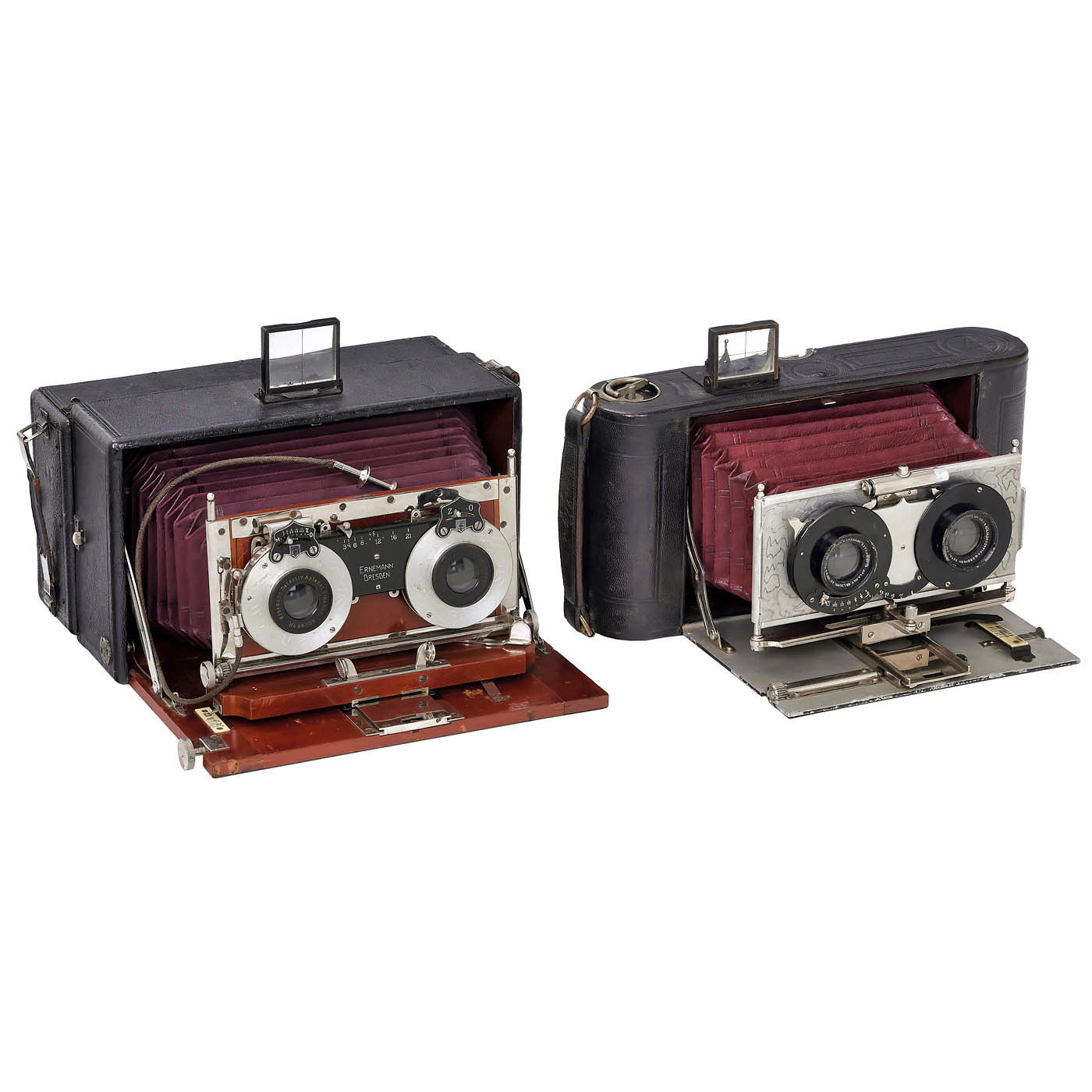 1) Heinrich Ernemann A.G., Dresden. Folding-bed stereo camera for plates of 9 x 18 cm, with attached magazine, internal stereo-divider, changeable lens board with Ernemann Detectiv Aplanat 6.8 / approx. 140 mm lens, iris diaphragms 6.8–21, two-blade shutter Z, O, ½–1/100 sec., rack-and-pinion focus setting, Newton finder. Excellent condition! – And: 2) Hüttig, Dresden. Lloyd Stereo for 2 exposures of 8.5 x 7 cm on 9.3 cm rollfilm, with stereo-divider that can be swung in / out for 8.5 x 14 cm panorama format, Hüttig Baldour 8/125 mm lens and B, T, 1–1/100 sec. shutter (sluggish).