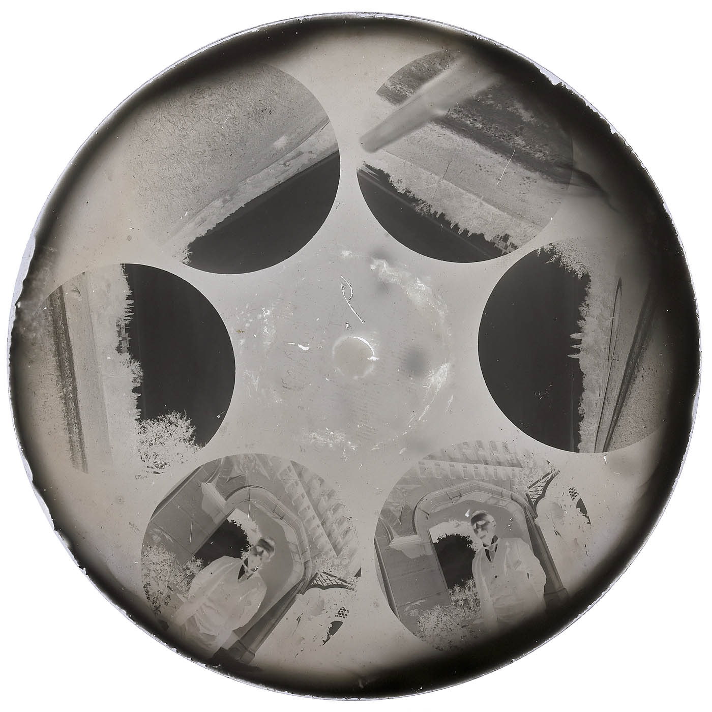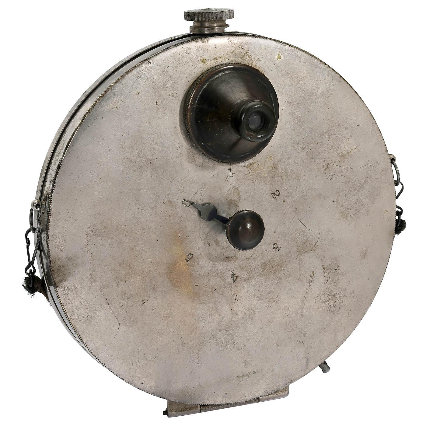 C.P. Stirn, Berlin, No. 3029, nickel-plated version, for 6 exposures of 4.1 cm, with periscope lens, guillotine shutter (sticking), aluminum locking mechanism and extremely rare original exposed plate, camera diameter 14.8 cm.