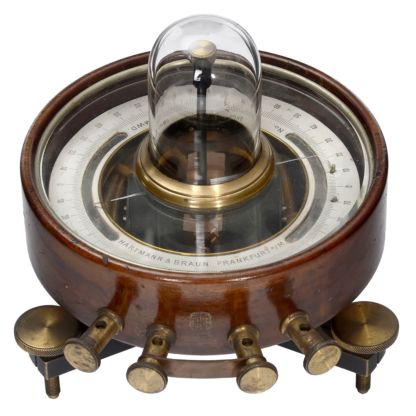 Hartmann & Braun, Frankfurt. No. 663, silk thread with moving magnet and aluminum needle under glass dome, 2 electromagnets, scale, in circular walnut case, 4 connections, needle lock lever, 3 adjusting feet, Ø 5 ½ in.