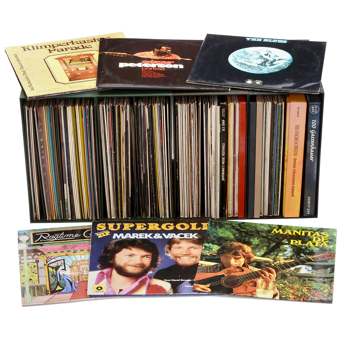 1) 18 Oscar Peterson records, including Digital at Montreux, Night Train, Canadian Suite and Live at the Northsea Jazz Festival. – 2) 5 of Erroll Garner. – 3) 6 Boogie-Woogie records, including Sammy Price, Vince Weber, Axel Zwingenberger and James Booker. – 4) 5 blues records, including Sam Hopkins, Brownie McGhee and Otis Spann. – 5) 3 Marilyn Monroe picture records. – 6) 26 records by Cannonball or Nat Adderley. – 7) 70 miscellaneous jazz records, including Coleman Hawkins, Dizzy Gillespie, Ella Fitzgerald, Glenn Miller, Wild Bill Davis, Jimmy Smith, Jan Voss, Sonny Rollins, Thelonious Monk, Art Blakey, Houston Person, Clifford Brown, Dexter Gordon, The Dutch Swing Collage Band, Django Reinhardt and many more performers. – 8) 10 rock and pop records. – 9) 55 records by German cabaret and entertainment artists, including Die Stachelschweine, Werner Schneyder, Werner Finck and Otto. – And: 10) 46 records with titles played by mechanical musical instruments. – In addition: Philips compact system with record player, radio and amplifier (cassette recorder belt defective) and 2 loudspeakers.