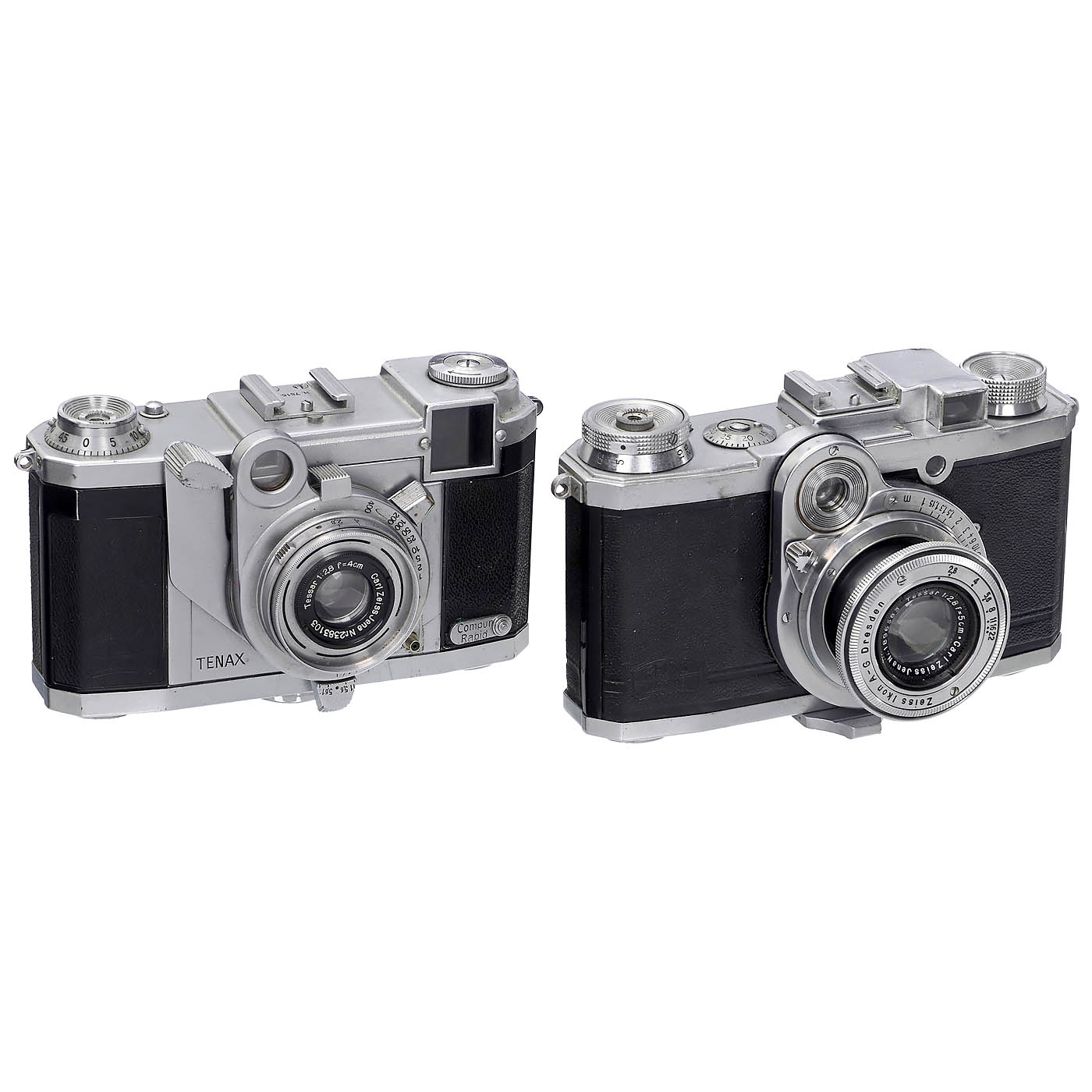 Zeiss Ikon, Dresden. 1) Tenax II (580/27) no. H.75153, for 24 x 24 mm, with Tessar 2.8/4 cm lens no. 2383103, shutter slow, front with synchronisation, scratch on baseplate. (3-/4) - And: 2) Nettax (528/24) no. B.30542, with interchangeable Tessar 2.8/5 cm lens no. 1896683, shutter and rangefinder working, back no. C.88731, small dents on rangefinder. - Note: Only around 3,000 Nettax cameras were produced. (3/2-) - Literature: Bernd K. Otto, "Carl Zeiss Kamera-Register 1902-2012", p. 753.