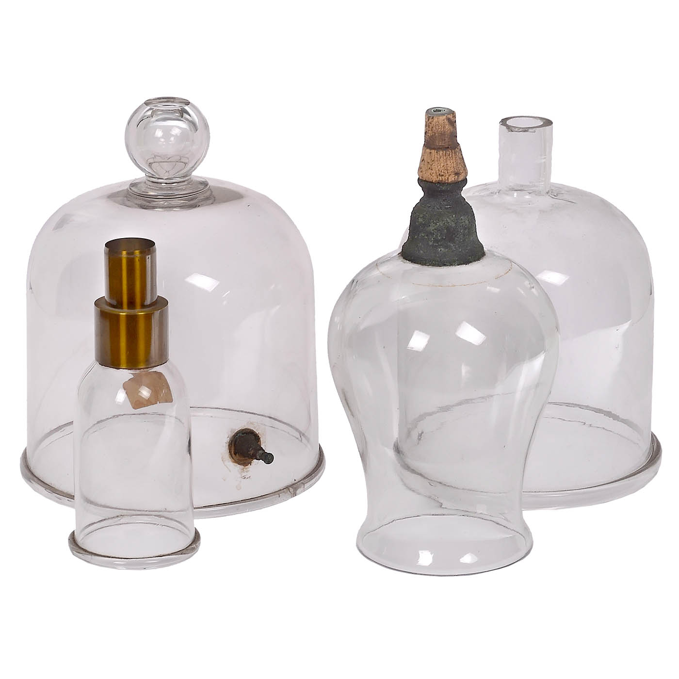 Engraved "Benevolo & Coquais à Lyon", original lacquered brass, with 2 recipients, a pressure gauge mounted on a steel scale within a domed glass tube, a Ø 10 5/8 in. glass-covered vacuum table and a glass bell-jar, overall height 19 5/8 in. The accessories consist of Magdeburg hemispherees engraved "Benevolo & Coquais, Passage del Hotel Dien, Lyon", 3 additional glass domes, siphon fountain and suction lifter.