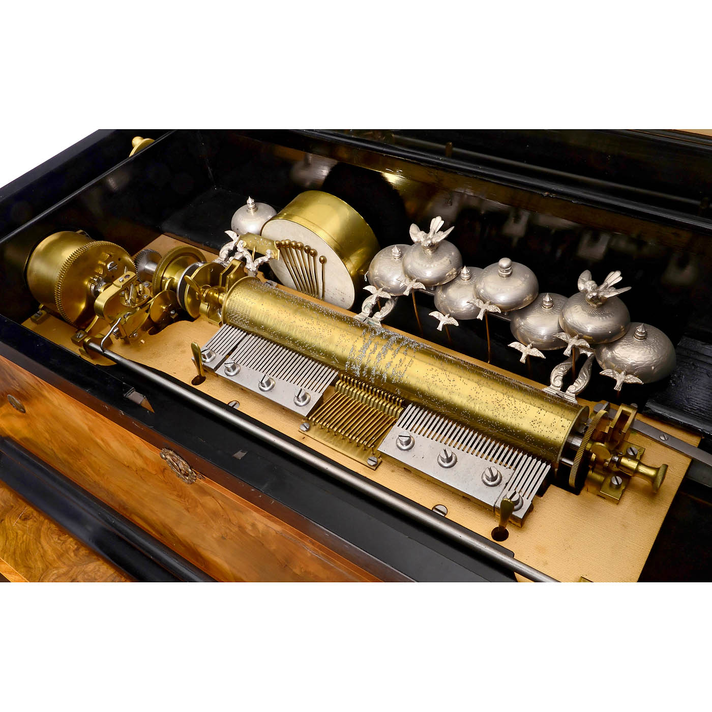 No. 38018, possibly Karrer, with six eight-air cylinders, seventeen-key organ, 55 musical steel teeth and 16 percussion teeth in four combs (approx. 18 tips replaced), optional drum, seven optional engine-turned bells and one dummy with bird strikers, two with bird finials, tune-indicator and tune-sheet, in book-matched walnut-veneered case with kingwood banding and quarter-veneered lid, on matching table with drop-front cylinder-storage drawer, wd. complete 42 ½ in. (108 cm), cylinders 13 in. (33 cm), restored playing condition.