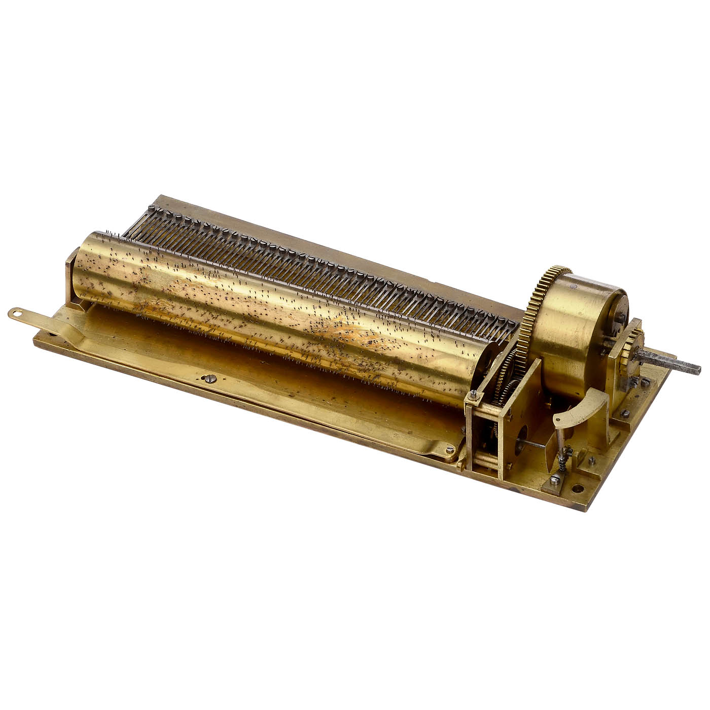 Probably Vienna, playing four airs, with sectional comb in 38 groups of two (complete, approx. nine groups neatly replaced), bass teeth to the right, brass bedplate and seven-gear governor-train located behind the spring-barrel, 3 ¾ x 9 ½ in. (9.5 x 24 cm), the cylinder 6 ¾ in. (17.5 cm), working but in need of adjustment.