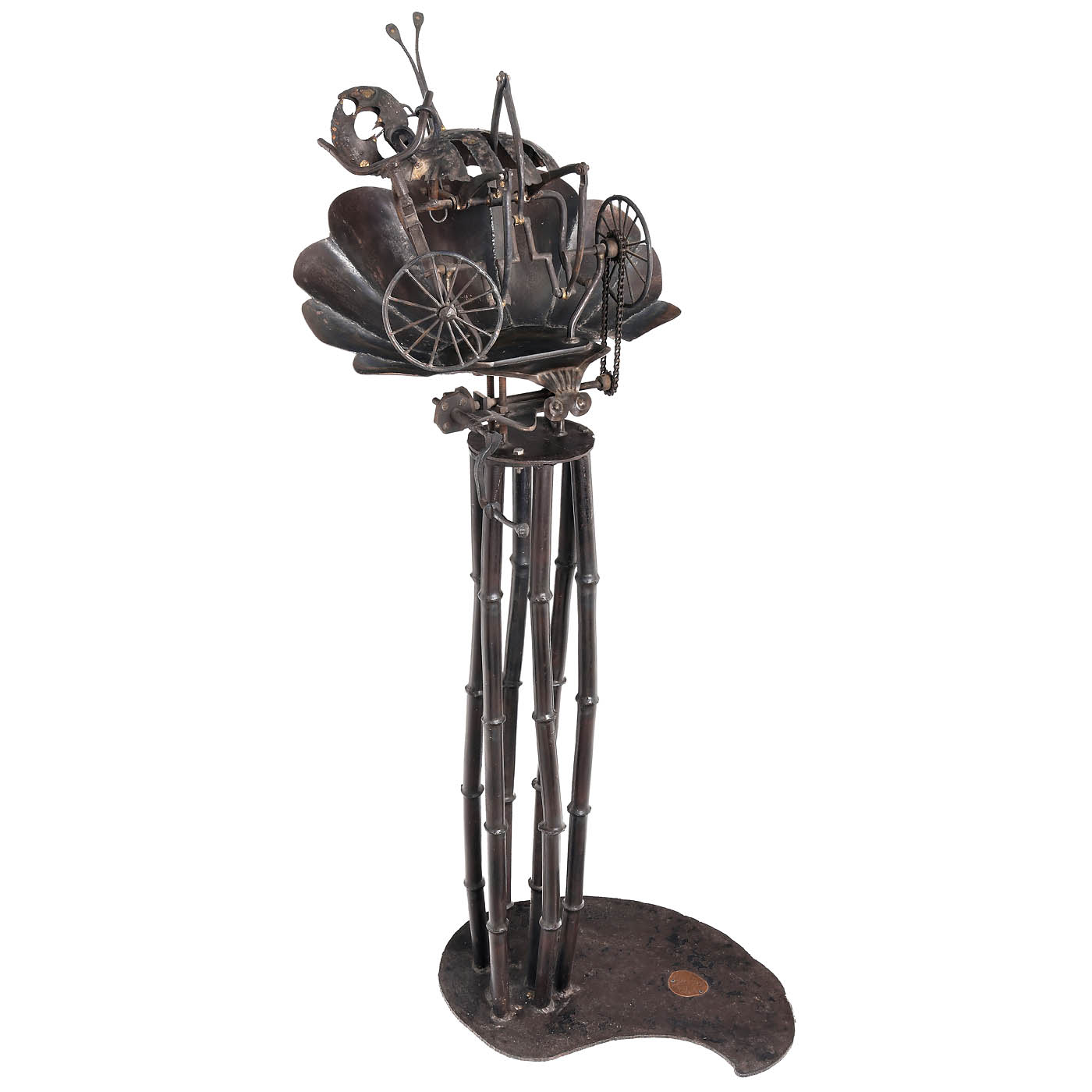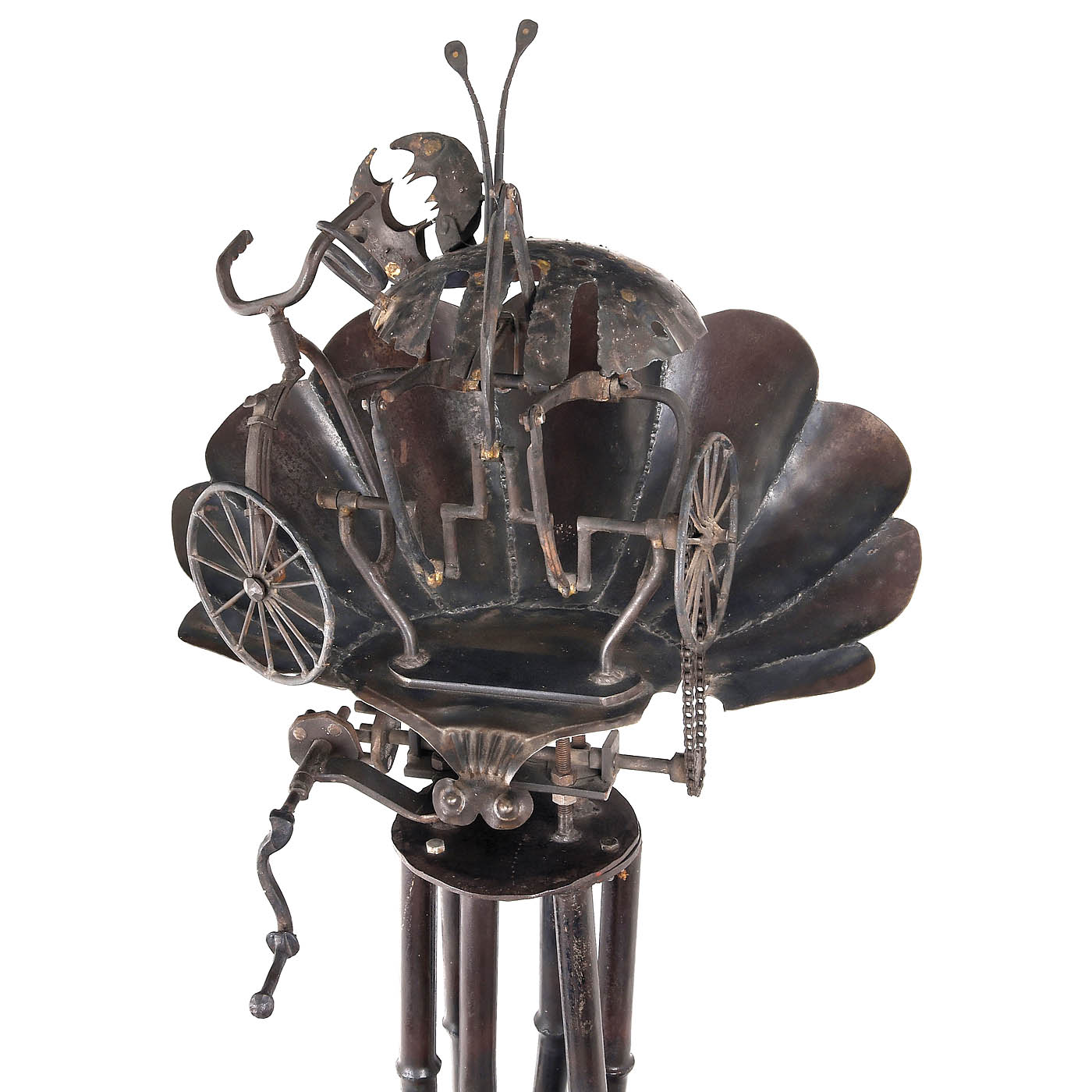 Wrought and brazed steel, depicting an anthropomorphic crustacean on a bicycle, with hand-cranked mechanism operating an axle with chain to the rear wheel and a camshaft for the crab’s three double-jointed legs and hinged claw, on six crab-like legs to base with copper plaque engraved: "Cycling Crab", ht. 53 in. (165 cm), working. - Literature: Andrea Robertson, 1992, "Museum of Automata", p. 78. - Robertson cites Mills: "I started making steel automata at college in 1980 and by 1985 had slowly moved into semi-functional furniture. A delight with making things that work (to nobody’s criteria other than my own), combined with childhood memories of the smells in my Dad’s metal-pressing factory, are probably both contributory factors in my work".
