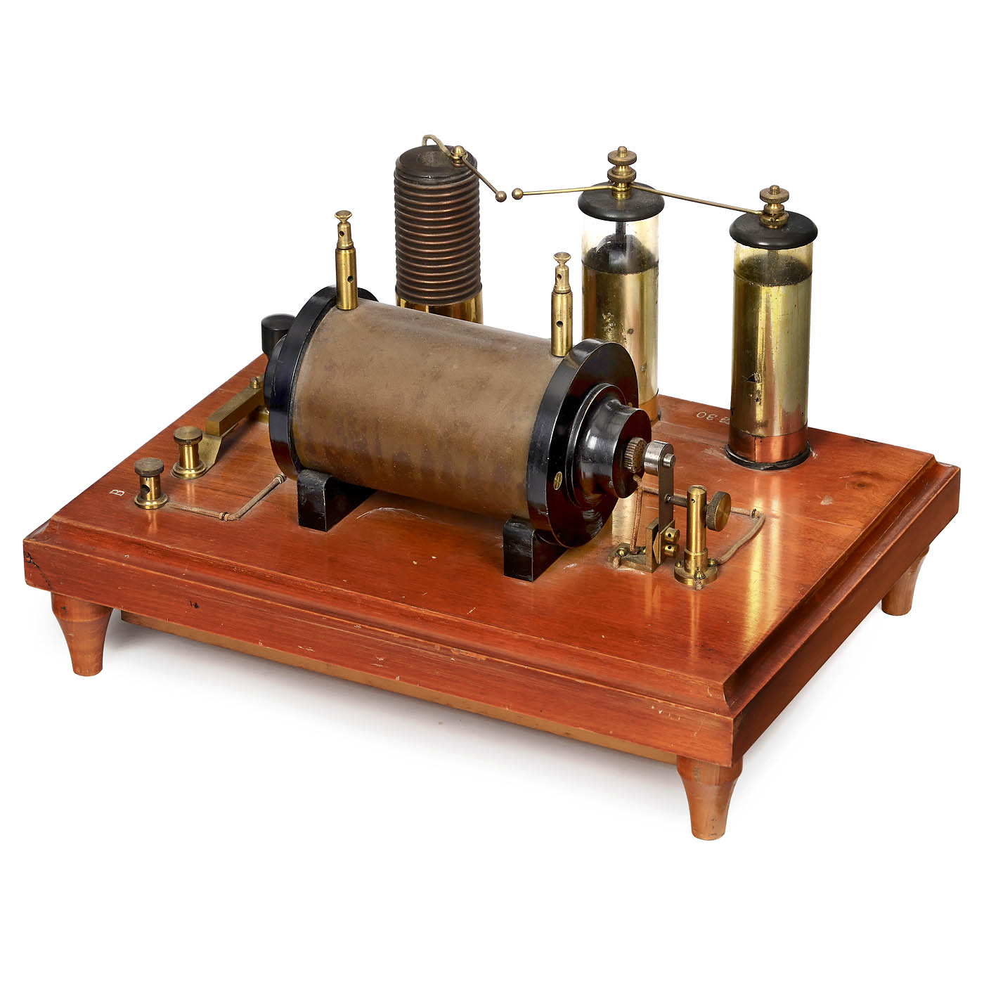 AEG, Berlin. No. 30, consisting of 2 Leyden bottles, setting coil, induction coil and Morse key, on walnut base with surface capacitor in the lower part, 14 ½ x 10 5/8 in. - Note: In conjunction with a receiver, this model was used to carry out the first successful attempts at a radio link between the AEG administration building and the Oberspree headquarters in Berlin over a distance of 15 km.