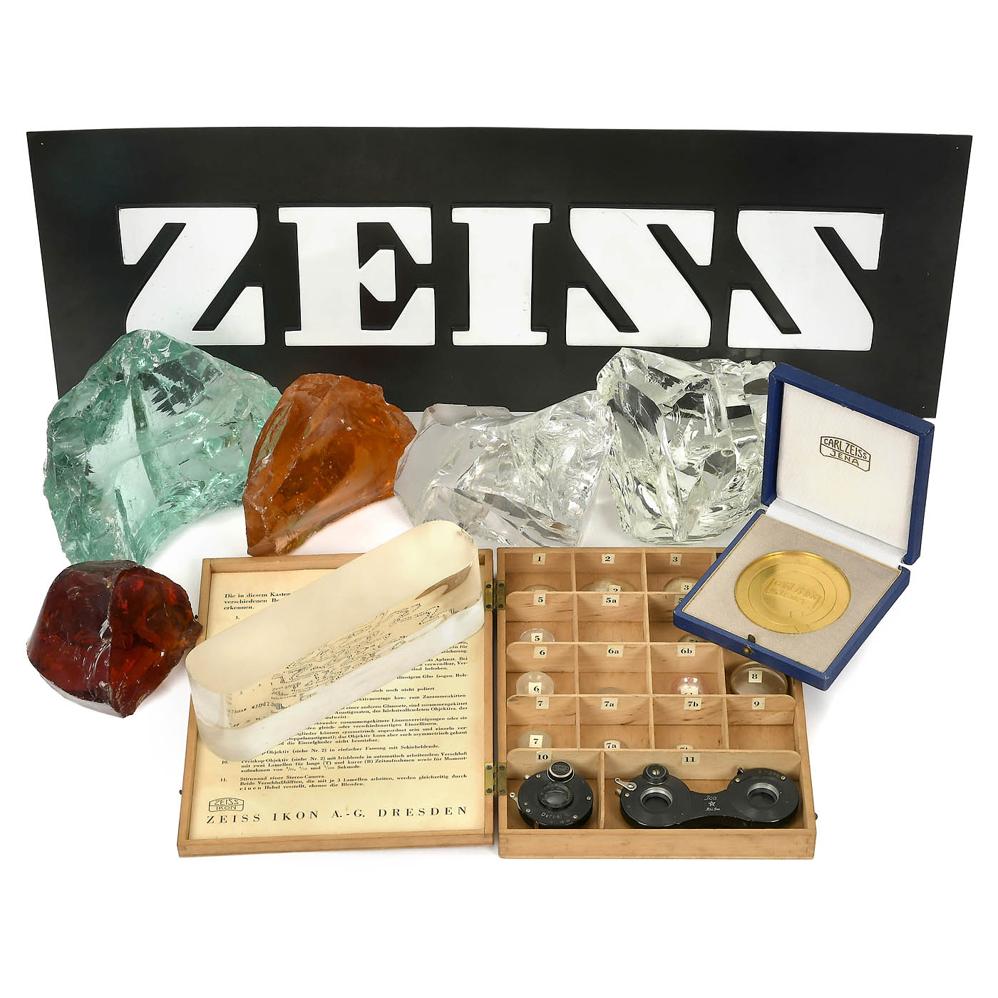 Illustrative material from Zeiss. 1) Zeiss Ikon, Dresden. Display of the manufacturing stages of lenses, two components missing, in wood display case with text, 18 x 24 cm. - 2-4) Optical raw glass, unprocessed. - 5-6) Optical filter glass, unprocessed. - 7) Processed raw glass 20 x 6 x 5 cm, polished flat on the front to check for streaks, with inspection notes. - 8) Carl Zeiss Jena plaque in blue case. - And: 9) Zeiss (Oberkochen) embossed display, 24 x 59 cm.