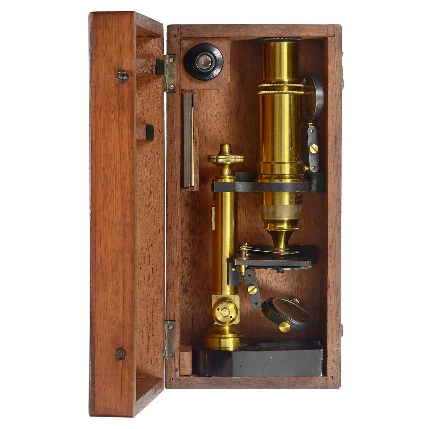 Unmarked, original lacquered brass, with stage condensors, 1 eyepiece, 3 objectives screwed into each other, in matching mahogany cases. 1) Black-painted horseshoe base, single mirror, substage pinhole disc, sliding tube, fine adjustment with knurled screw on the column, height 10 1/5 in. - 2) Probably France (Hartnack or Nachet), circular leaded brass base, tubular pillar with a ball-and-socket foot, single mirror, adjustment with rack-and-pinion drive, height 9 in. - And: 3) Presumably France, green-and-gold-painted cast-metal square base with pair of tubular pillars, double mirror (1 mirror damaged), substage pinhole disc, rack and pinion adjustment, height 10 1/5 in.