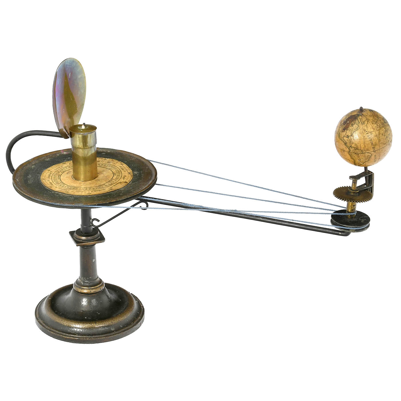 Physical demonstration model, bronzed cast-metal and brass, 2 in. plaster globe with lithographed gores, marked "Aug. Riese, Berlin", compass showing the houses of the zodiac, globe and compass with German lettering, the sun as a candle with brass reflector, overall length 14 1/5 in.
