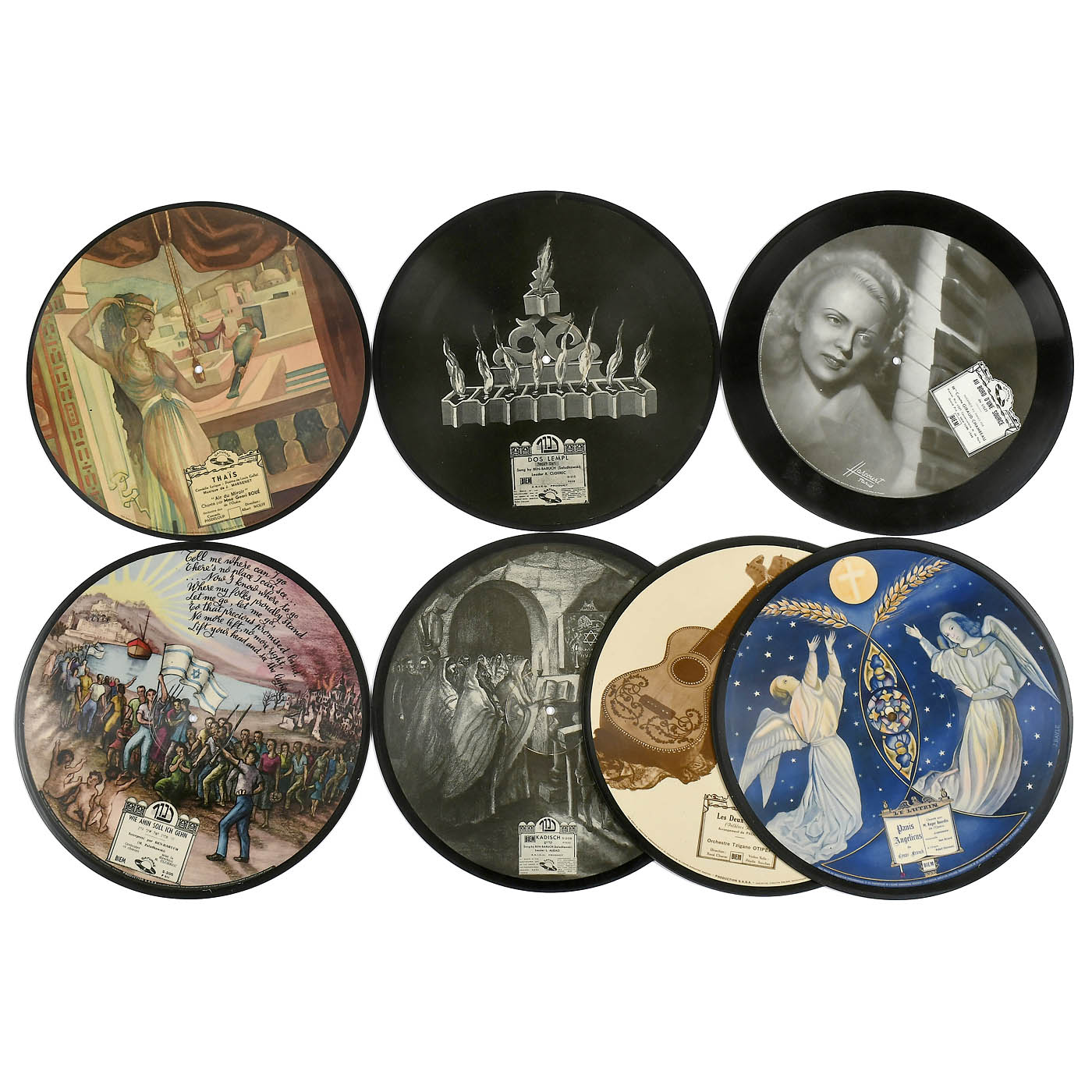 Société des Arts et Sciences Appliquées (S.A.S.A.), Paris; 78 UpM, Ø 25 and 30 cm: AR-154, Zerrouki Allaoua, "Les Amis d'Aujourd'hui / Emballage". - 3880/3883, André Pasdoc, "Tu Pleurais / Au Son des Castagnettes". - V902/V903, Marcel Coestier, "Couci-Couca / Un Champ de Blé". - I116/I126, Geori Boué, "La Veuve Joyeuse / Monsieur Beaucaire". - 8080/8081, Alphonso, "Petit Oiseau des Iles / Samba du Vaudou". - I114/I115, Quatuor de Saxophones, "Suite Francaise No 5 A und B". - V851/V852, Simone Couderc, "Invocation à Brahma / La Solitaire". - V869/V870, Le Quintette Guy Rios, "Tangage / En Attendant Ton Retour". - 1140/1143, Alphonso, "La Criolla / Ram Da Ba La". - 1405/1406, Orchestre de Dans André, "Bleu du Ciel / Dans Mon Quartier". - V700/V701, Tommy Desserre, " Au Temps de la Cour / Ma Guepière et mes Longs Jupons". - 1358/1359, Cuban Pett, "Linda Casablanca / El Muletero". - 1446/1448, Colette Herent, "Berceuse a Nounourse / Le Petit Chemin de Fer". - V859/V860, Henry Gold, "Le Violon de Paris / Le Chale de Soie". - 1383/1385, Marcelle Normand, "Marco le Bandit / Valse Folle". - 1414/1415, Orchestre de Dans André, "Étrange Douceur / Porte Cochère". - S215, Ben Baruch, "Zol Noch Sain Schabbes / Dos Lempl". - I122/I124, Geori Boué, "Thais / Hérodiade". - S209, Ben Baruch, "Kadisch / ?". - V879/V880, Colette Giraud-Chambeau, "Au Bord D'une Source". - 139/140, Tzigane Otipep, "Echo de Hongrie / Les Deux Guitares". - S205, Ben-Baruch, "S'Wet Geschehn / Wie ahin soll ich gehn". - 141/142, Roger Bourdin, "Ave Maria / Panis Angelicus".