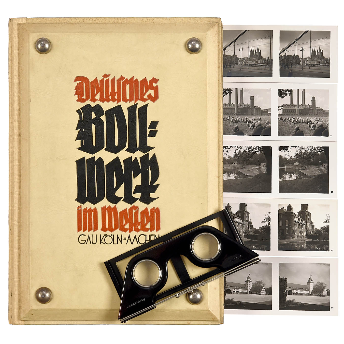 Schönstein Verlag/Heinrich Hoffmann, Munich. Titled in German: "German Bastion in the West of the Reich - Gau Cologne-Aachen", 100 stereo photographs by Heinrich Hoffmann, text by Heinz Havertz on 62 pages, pp. 1-8 on "The Cologne Ford Plant", with viewer and complete 100 stereo cards, 6 x 13 cm. The images of this rare album were taken with the Heidoscop camera.