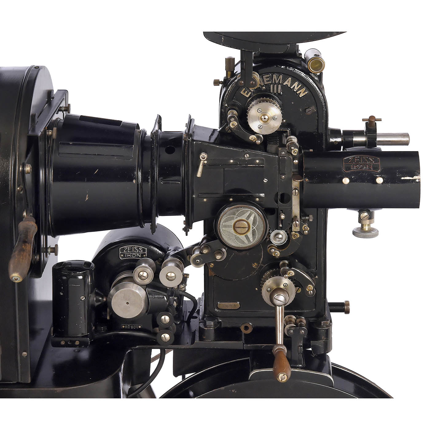 Zeiss Ikon, Dresden. Film projector for 35mm silent and sound films, Maltese cross mechanism, protected front diaphragm, two fire-protection drums for 600m spools. Drive: hand crank or via the adjustable original Zeiss Ikon motor. Zeiss Ikon lamp housing with the original carbon arc lamp. Everything mounted on cast-steel table. Complemented by a Zeiss Ikon light sound scanner. Projection lens: Super-Kiptar 2/70 mm. Accessories: loudspeaker, amplifier and all necessary parts for sound film projection. - Please note: Electrical parts should always be checked by a qualified electrician before use! - Special feature of this unique offer: This rare Ernemann III cinema projector was equipped with special accessories such as a low-voltage halogen lamp and transformer, rectifier, amplifier and loudspeaker for demonstration purposes (function of the historical sound film technology) without changing the technical components and can be used immediately for the projection of optical sound copies (a roll is included) and can be connected to any normal 230-volt socket. The function can be demonstrated on request during the preview. Never offered in this functionality at one of our auctions before.