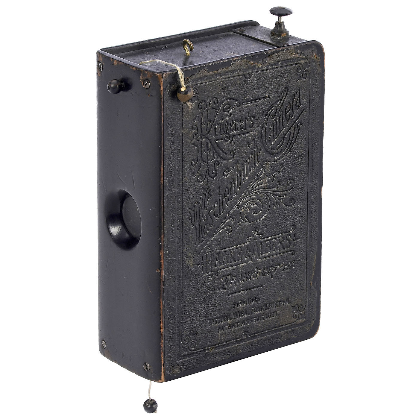Haake & Albers, Frankfurt. For exposures of 4 x 4 cm, with five internal film-holders, leather on side stamped: "Krügener's Taschenbuch-Camera Haake & Albers Frankfurt a/M, Prämiert: Dresden, Wien, Frankfurt – Patent angemeldet", shutter working, first sector mobile, second sector sticking.