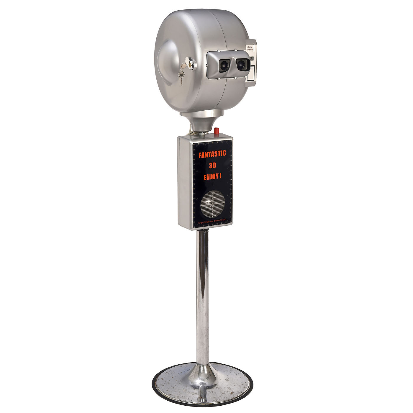 HangZhou 3-D World Photographic Equipment Co., Ltd., China. Professional stereo viewer for ten 6 x 6 cm color slides (ten included) on revolving disc, height 143 cm, apparently 110 volts, top removable for ease of transport, with Chinese instructions, key and packet of ten frames, chrome on base with scattered spots, otherwise cosmetically well preserved, electronics and sound reproduction untested.