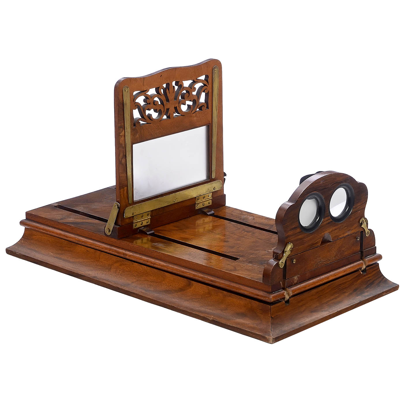 1) France (attributed). Large graphoscope made of solid walnut, 30 x 60 x 12 cm, the large viewing lens (diameter 155 mm) can be snapped into the device, after folding it away into the storage compartment for pictures, the stereo viewer can be folded out and then has a height of 51 cm. The image stand with focusing screen (for stereo slides) can be moved approx. 34 cm for focusing. (3/3) – 2) 30 collotypes of paintings and drawings from c. 1870. – 3) 12 photographs 9 x 16.5 cm, presumably of anthroposophical actors. – 4) 3 cabinet cards: "Assassinat des otages à la prison de la Roquette le 24 Mai 1871" (the trigger for the uprising), "Prison des Chantiers à Versailles, le 15 Aout 1871" and "Gouvernement de la defense nationale (4 Septembre 1870)". Cards very faded. Important historical documents. – 5) 22 cards 9 x 15 cm by N. Paul phot. (Paris) 236, rue du F. St. Martin. Photos of destroyed Paris. – And: 6) 17 stereo cards 9 x 18 cm "Ruines de Paris (1871)".