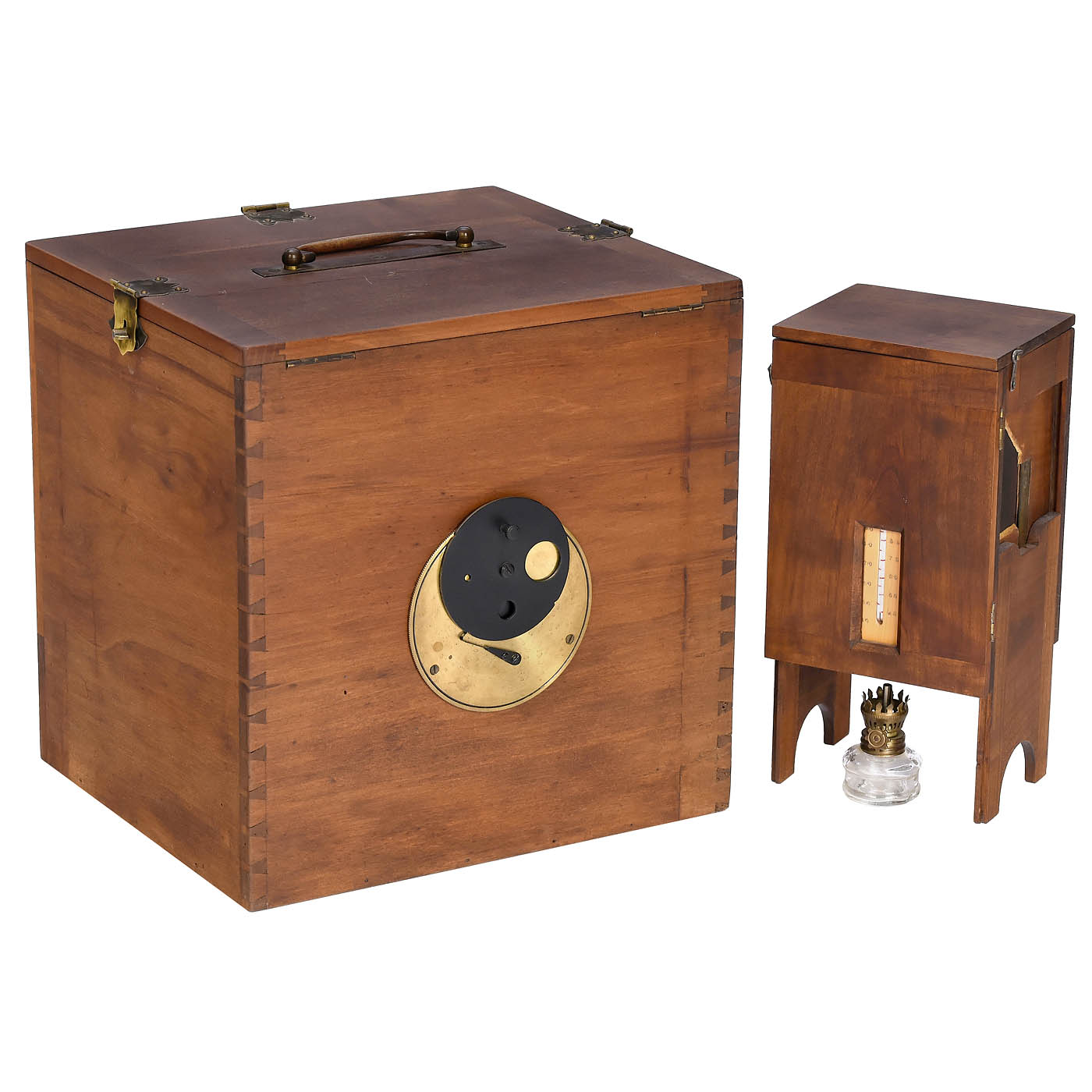Wooden box 26.5 x 23 x 28 cm, can be opened from the top and back, from the top there is a removable compartment with 2 boxes and space for 10 chemical bottles, one box for storing 81 x 67 mm daguerreotype plates (including a corroded daguerreotype for demonstration purposes, stamped 30 on the back), the other box has a removable tray lined with glass for fixing and the box itself is lined with glass for rinsing. At the bottom of the wooden box there is a separate development box with extendable feet to allow a small burner to be placed underneath to heat the mercury (controllable via the built-in thermometer). In the box there are two small compartments for two additional glass bottles, a focusing screen magnifying glass and a pair of glasses from that era for viewing the focusing screen image (focusing screen is missing, can be replaced). The whole box serves as a camera with a built-in, functioning brass-bound lens with a revolver aperture and sliding focus for a circular image of 63mm, the plate holder is firmly attached with a hinge. – Literature: D’Agostini, "Photographic Lenses", 2011, p. 231. – Important exhibit showing the history of photography.