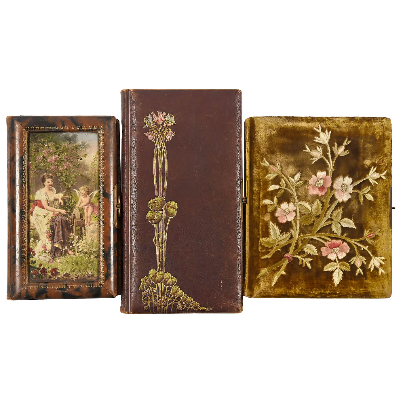 1) Leather album, 21 x 35 cm, with chromolithograph of Cupid sharpening arrows on the front, 14 plates for cartes de visite and cabinet cards, completely filled, some tears, with clasp. (3-/–) – 2) Velvet album, 27 x 34 cm, with floral embroidery on the front, 16 plates for cartes de visite and cabinet cards, completely filled, clasp missing. (3/–) – 3) Velvet album with elaborate embroidery on front, in linen-covered box marked "Quickborn", with 17 plates for cartes de visite and cabinet cards, containing photographs of the Talman Jahnke, Post and other families, many images inscribed, clasp loose. (3-/–) – 4) Velvet album with vacant brass cartouche, 16 plates for cartes de visite and cabinet cards, filled, some tears, clasp missing. (3–4/–) – And: 5) Vacant Art-Nouveau album with floral decoration, 23 x 42 cm, with 14 plates for cartes de visite and cabinet cards. (2–3/–)